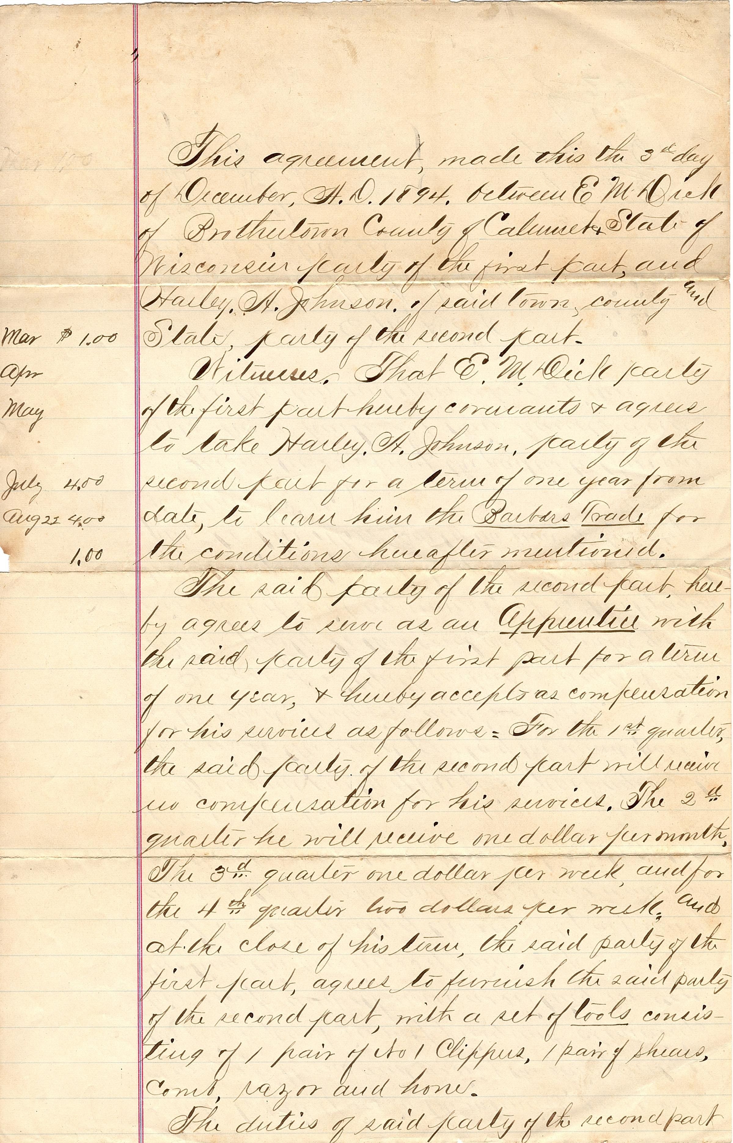 Single sheet of lined legal paper outlining the agreement between E.M. Dick and Harley A. Johnson for an apprenticeship for a year. Johnson is the apprentice and the document outlines the pay which includes room and board, then increases to $1, increases again to $2 and upon completion Johnson will receive a set of tools that include clippers, shears, comb, razor, and hone. It is signed by both E.M. Dick and H.A. Johnson in front of Theo Dick and John E. Hammar.Collection