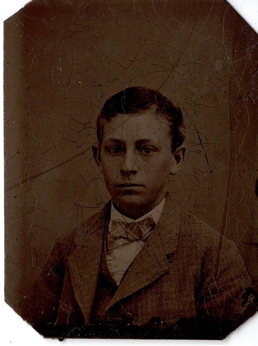 Tintype of a young boy in a suit coat and stripped bow tie. It came with seven other tintypes/photos in a single envelope with "E.M. Dick, Grace, Loth, Mabel, Phillip, #73" written on it in both black ink and pencil. This is most likely O.E. Heller's organization system.Collection
