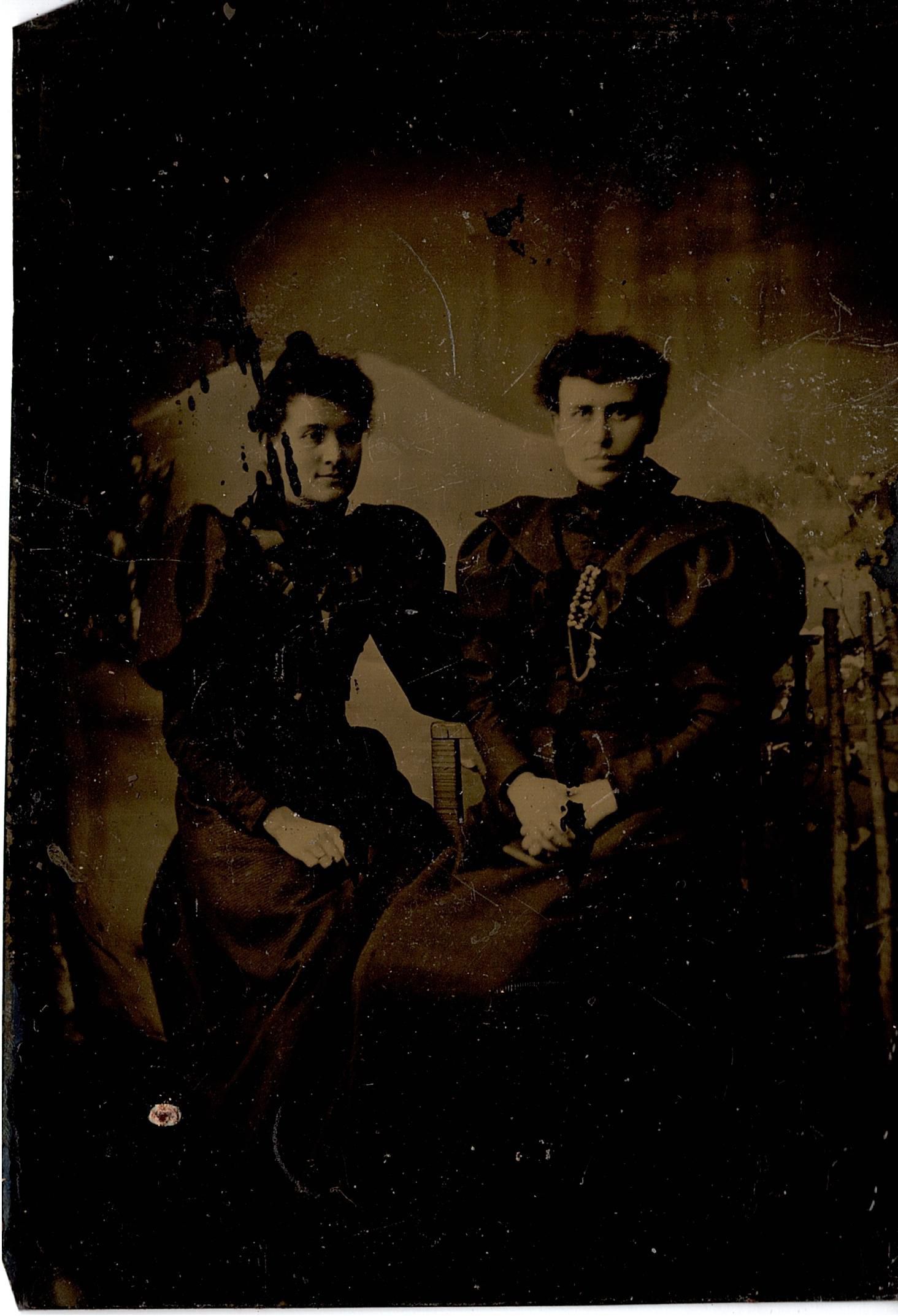 Tintype of two women. Both are wearing dark dresses with large shoulders/sleeves. The one on the right is wearing a necklace or brooch. Her hands are clasped in her lap. The second woman sits just behind the first and her left arm (right in image) is behind the first woman. It came with seven other tintypes/photos in a single envelope with "E.M. Dick, Grace, Loth, Mabel, Phillip, #73" written on it in both black ink and pencil. This is most likely O.E. Heller's organization system.Photograph Details