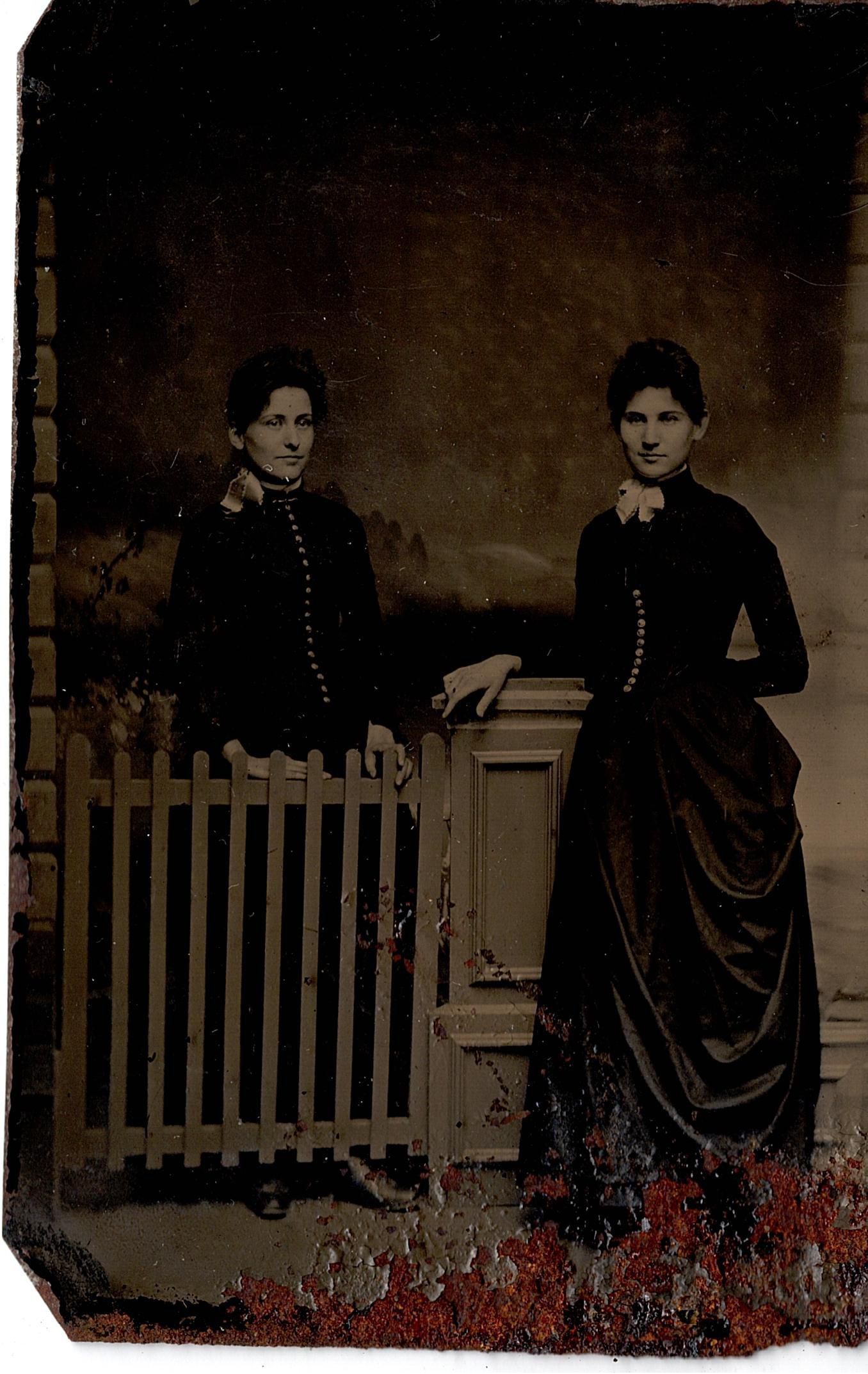 Tintype of two women. They are standing around a gate and pillar (in a photo studio). The one woman is behind the gate and is wearing a dark long sleeved dress with many buttons down the front, she has a bow to the side on her neck. The second woman is standing in front of the gate/pillar and is wearing a similar long sleeved, dark dress with a row of buttons down the front. She is also wearing a bow around her neck. Her right arm (left in image) is resting on the pillar and her left is behind her back. It came with seven other tintypes/photos in a single envelope with "E.M. Dick, Grace, Loth, Mabel, Phillip, #73" written on it in both black ink and pencil. This is most likely O.E. Heller's organization system.Photograph Details