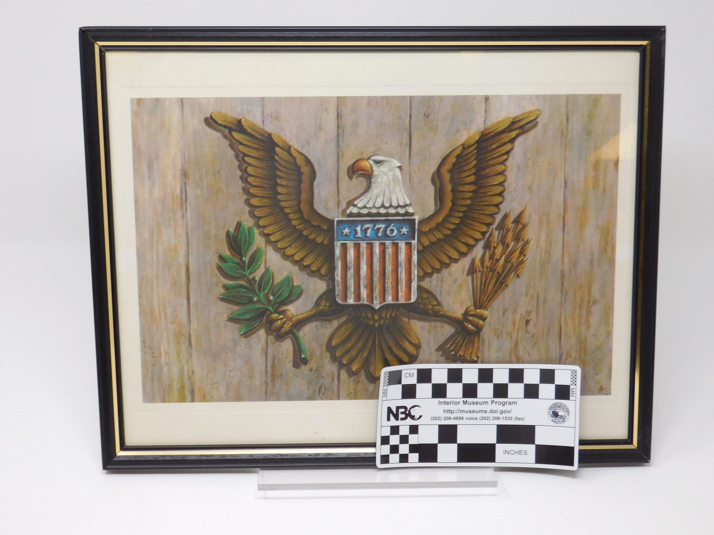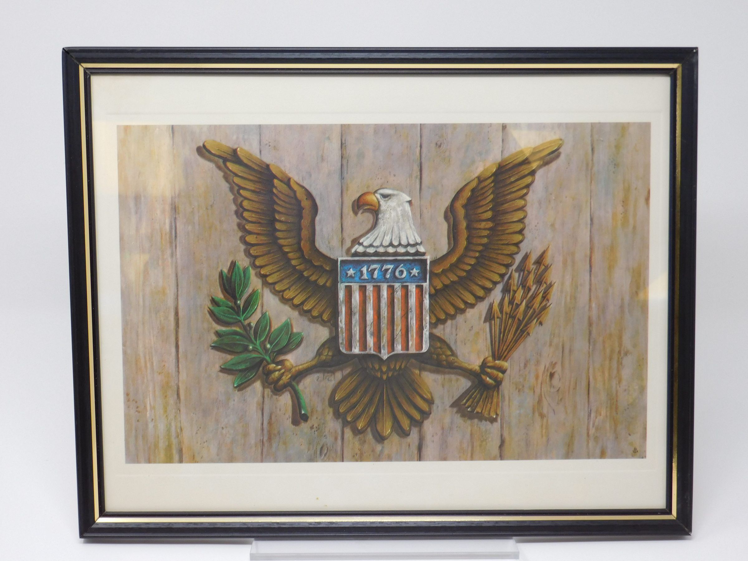 Framed print of an eagle holding an olive branch and a bundle of arrows with a red, white, and blue seal that reads "1776" over its chest. The background of the eagle are wood-like planks.Collection