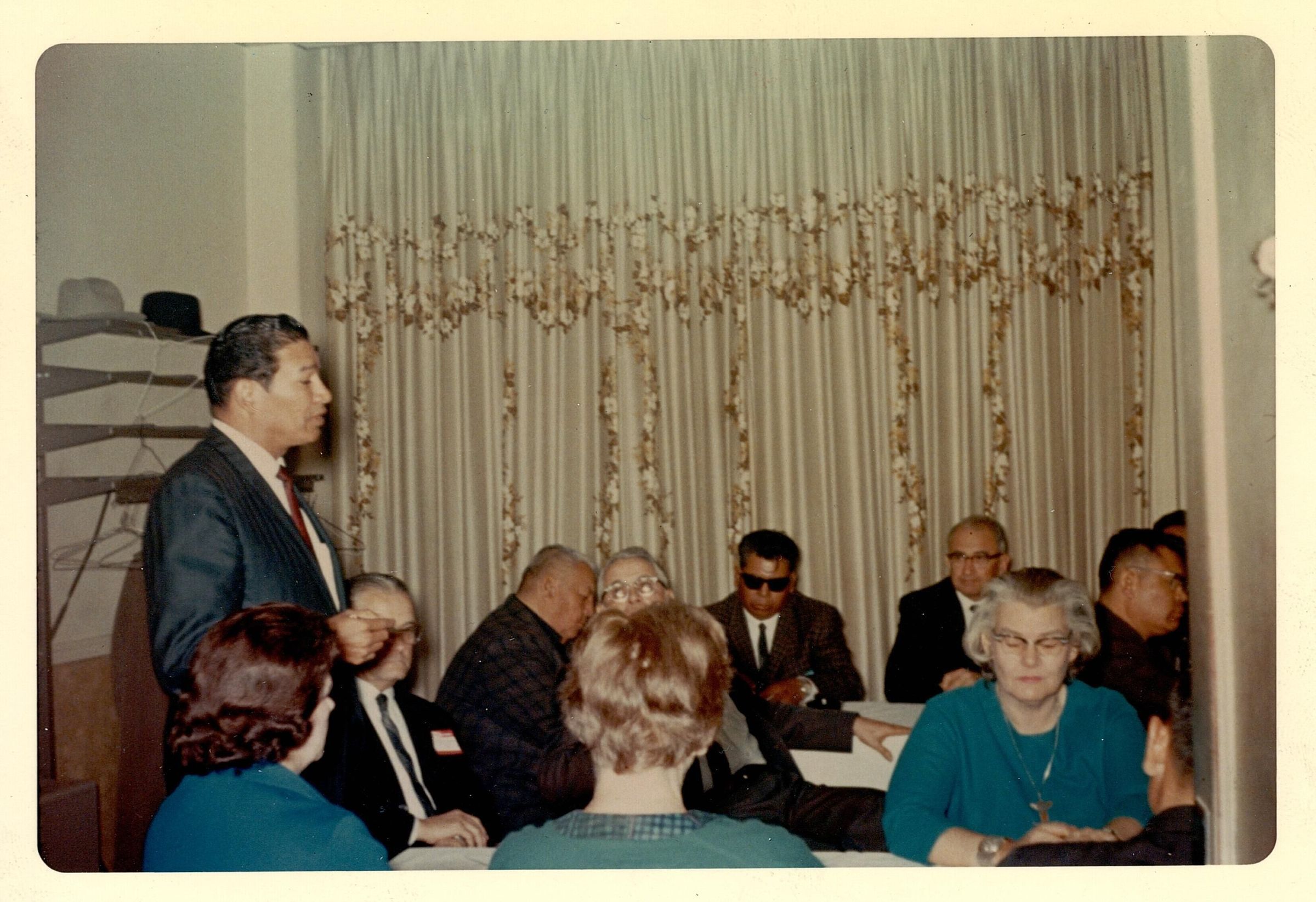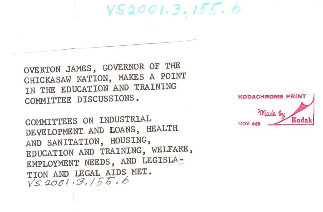 Colored photo of a man standing and addressing a room of individuals all sitting. The back reads "Overton James, Governor of the Chickasaw Nation, makes a point in the education and training committee discussions. Committees on Industrial Development and Loans, Health and Sanitation, Housing, Education and Training, Welfare, Employment Needs, and Legislation and Legal Aids met."Photograph Details