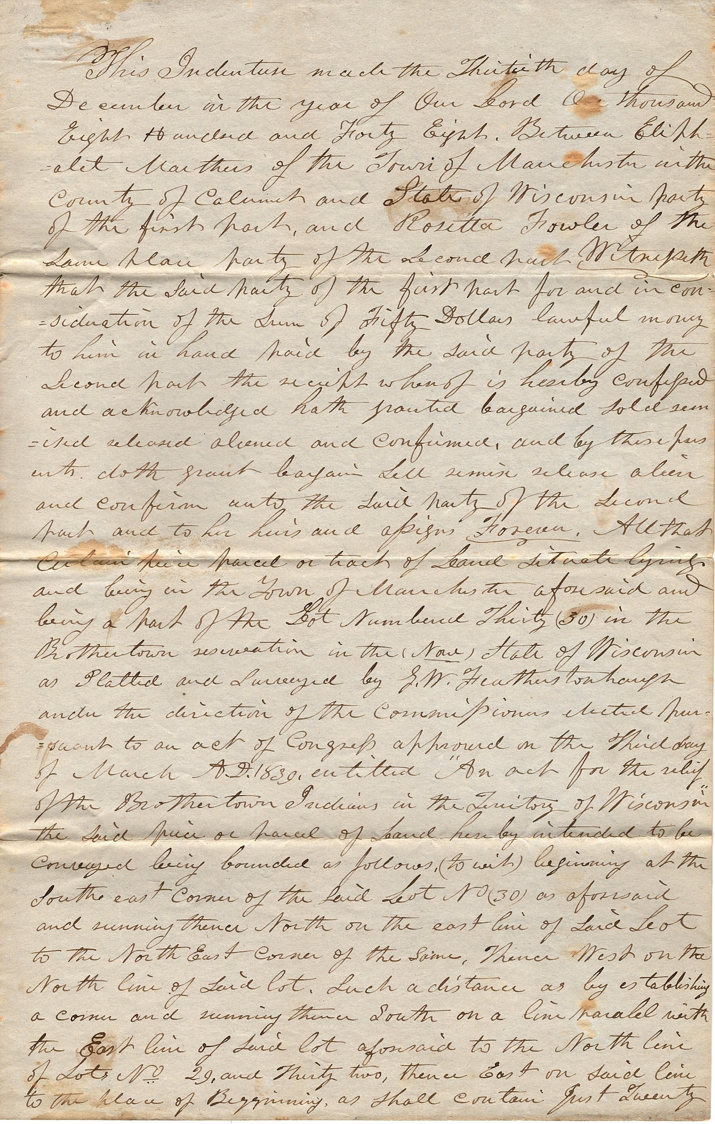 Official document-deed. Eliphalet Marthers to Rosetta Fowler Deed. Register's Office, Calumet County, Received for record Dec. 16th 1851. The indenture was written on December 30th, 1848 according to the document. It is written on a piece of blue-gray paper that is folded to create four pages of written documentation, including the cover page on the back.Collection