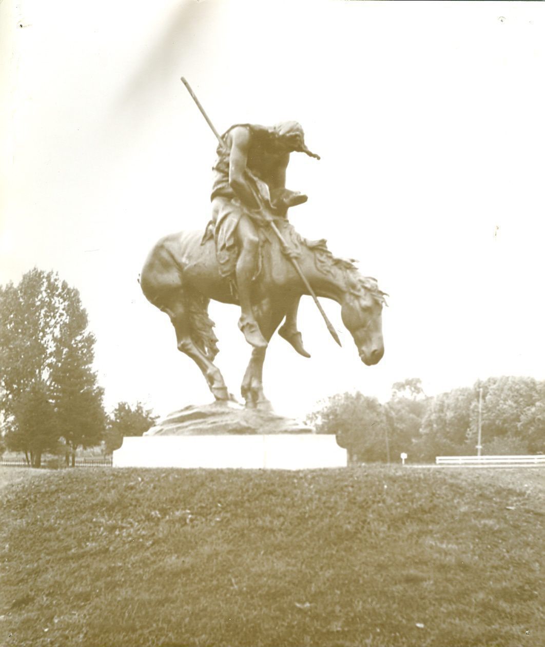 Picture of the large "End of the Trail" statue by James Earle Fraser in Waupun, Wisconsin. It depicts a Native man