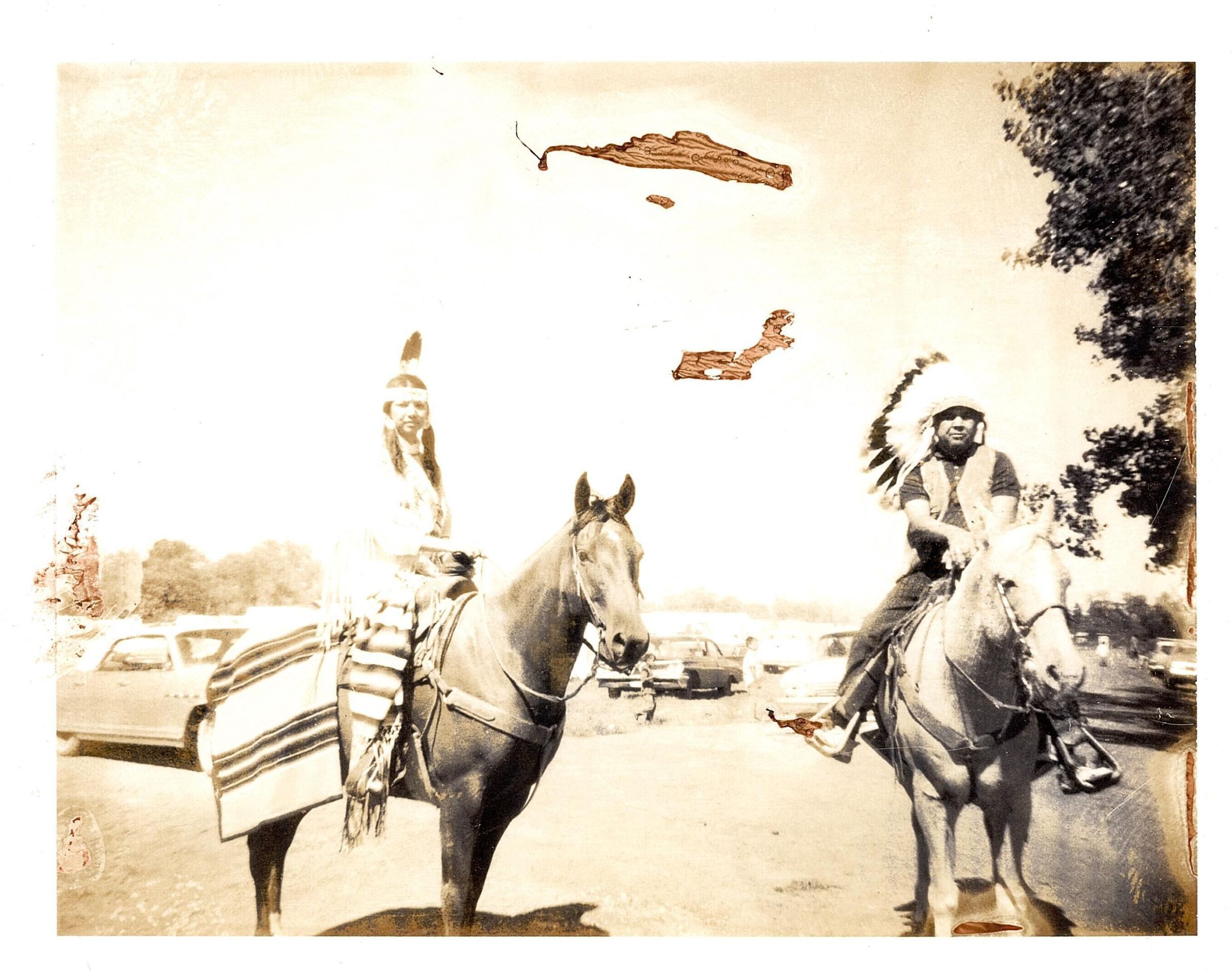 Black and white photograph of a male and female each on a horse. They are both wearing Native regalia including a headdress and a headband with a single feather standing up in the back. Behind them are multiple parked cars. Written in thick black ink on the back "Commissioner in parade at Oil Discovery Days, Ft Peck, Montana."Photograph Details