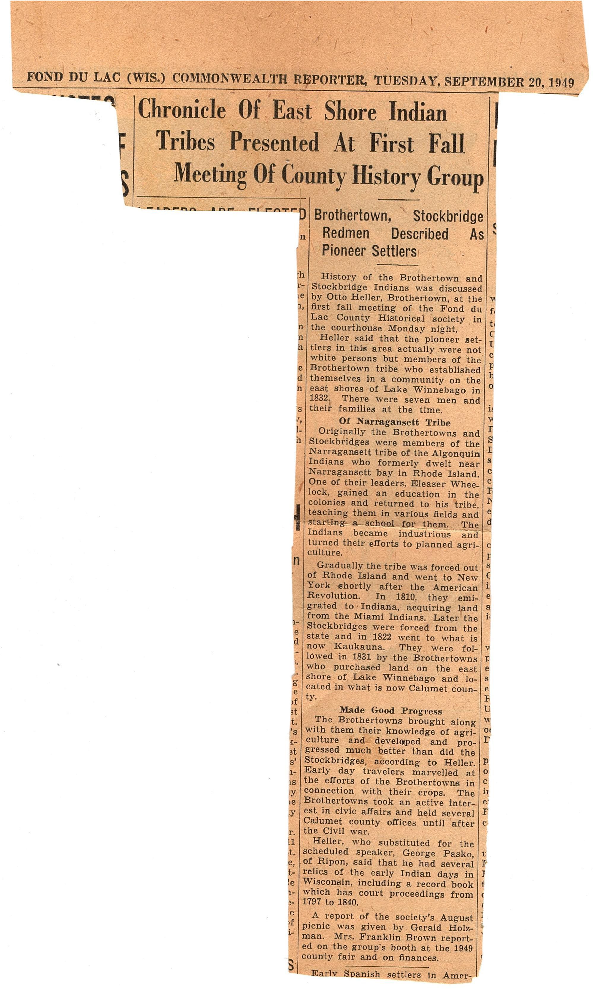 Clipping from the Fond du Lac Commonwealth Reporter from Tuesday, September 20, 1949. The articles reads "Chronicle of East Shore Indian Tribes Presented At First Fall Meeting Of County History Group. Brothertown, Stockbridge Redmen Described as Pioneer Settlers."Collection