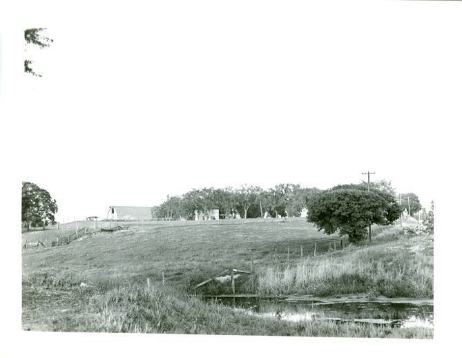 Photo of a farm with a creek at the bottom of a hill. Place unknown. Black and white photograph of a farm. There is a stream in the front, farm land split by a fence, and a barn and two story house in the distance.