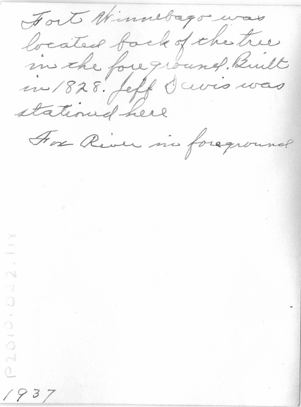 Written in black ink on the back "Fort Winnebago was located back of the tree in the foreground. Built in 1828. Jeff Davis was stationed here." In a different ink "Fox River in foreground, 1937".Collection