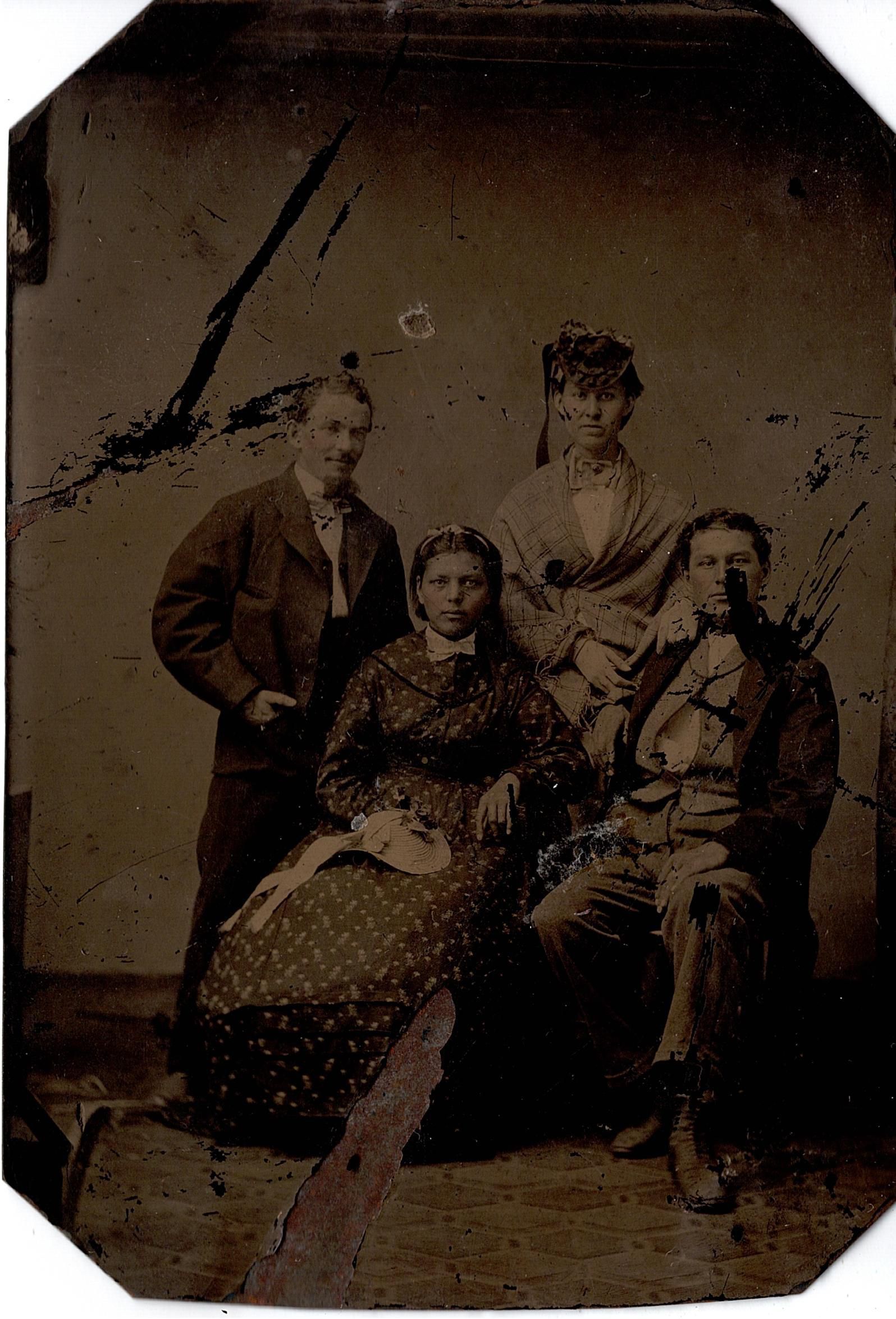 Tintype of a group of four individuals: two women and two men. A male and female are sitting in the front. The woman is wearing a patterned dress with a hat with ribbons or a fan with ribbons in her lap. The male sitting has a three piece suit on but the vest looks to be unbuttoned down the middle. The male and female standing in the back are wearing a suit (male) with his right hand in his pocket (left in image) and the woman is wearing a wrapped shawl with a hat. The photograph and three tintypes were in a single envelope with "Ms Weimer, -ffar---, -has and kids walking" in pencil; "Harsel" in brown pencil; and #60 in black ink in the bottom corner. The envelope is with BC2010.022.198A.Photograph Details