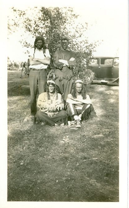them and three are wearing fringe on their shirt and/or pants. It appears they might have darkener on their faces. There is
