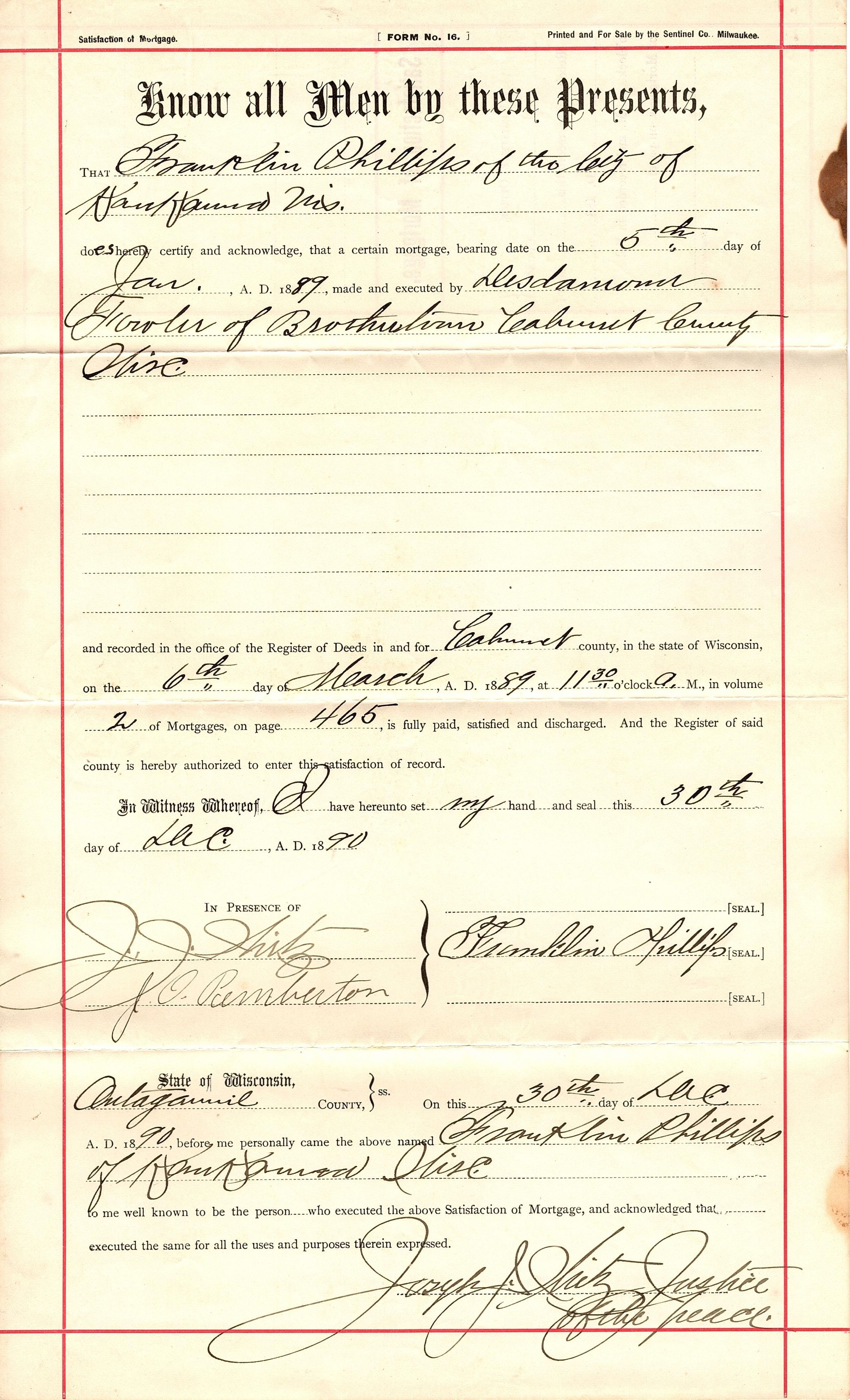 Legal sized official document-satisfaction of mortgage. The cover of the document was not filled out, but the document itself notes that the mortgage made January 5th, 1889 between Franklin Phillips and Desdamona Fowler has been satisfied and recorded on March 6th, 1889 in Calumet County. The form has a pink/red border.