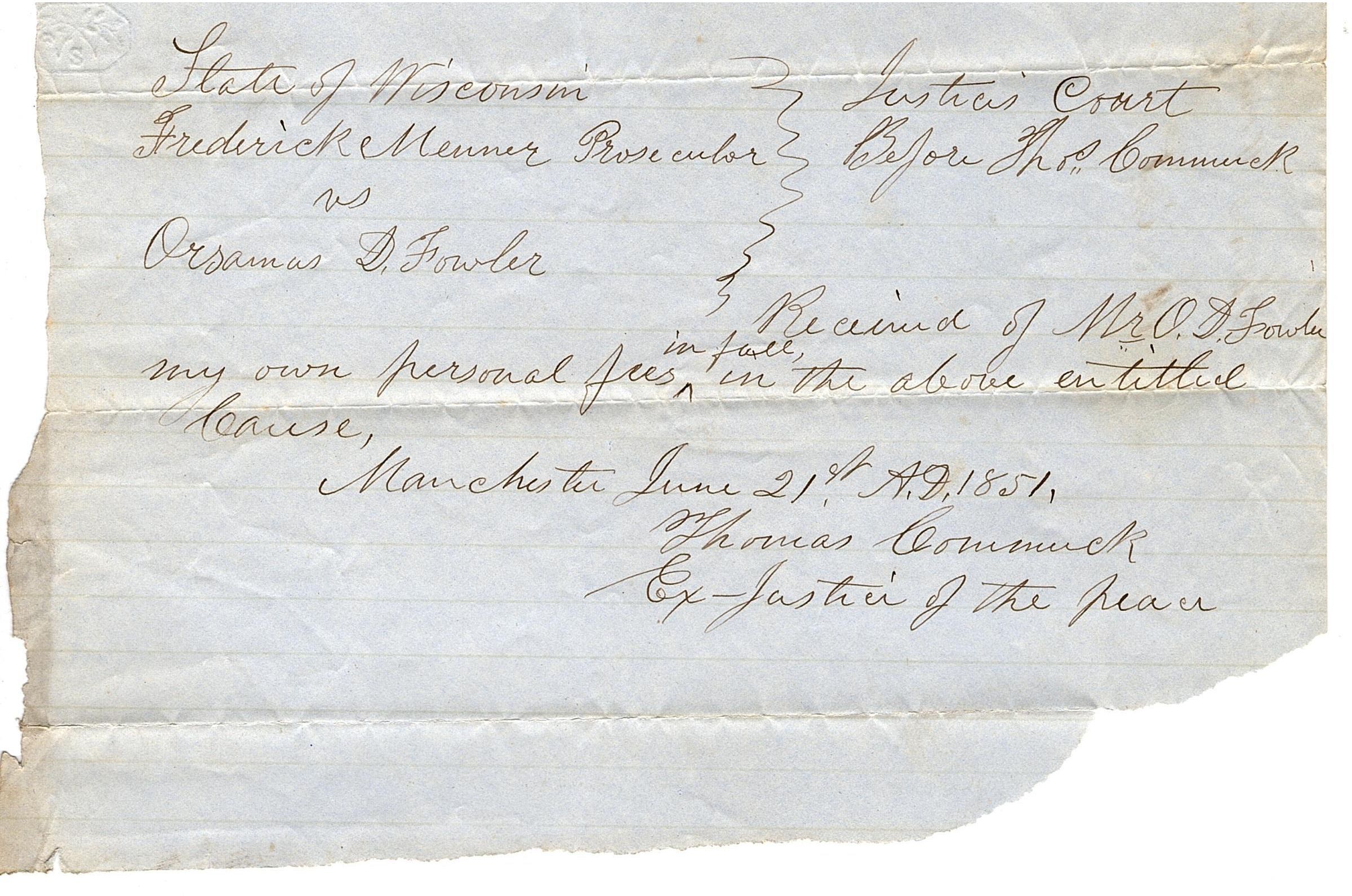 Half sheet of blue paper that reads "State of Wisconsin, Frederick Menner Proscecutor vs Orsamus D. Fowler, Justice Court Before Thos. Commuck. Received of Mr. O.D. Fowler my own personal fees in face in the above entitled cause, Manchester June 21st A.D. 1851, Thomas Commuck, Ex-Justice of the Peace". Written in black ink on the back it reads "Thomas Commuck Receipt". There appears to be a stamp in the top left corner on the front of an 'S' with two branches crossed above it and in an oval.Collection