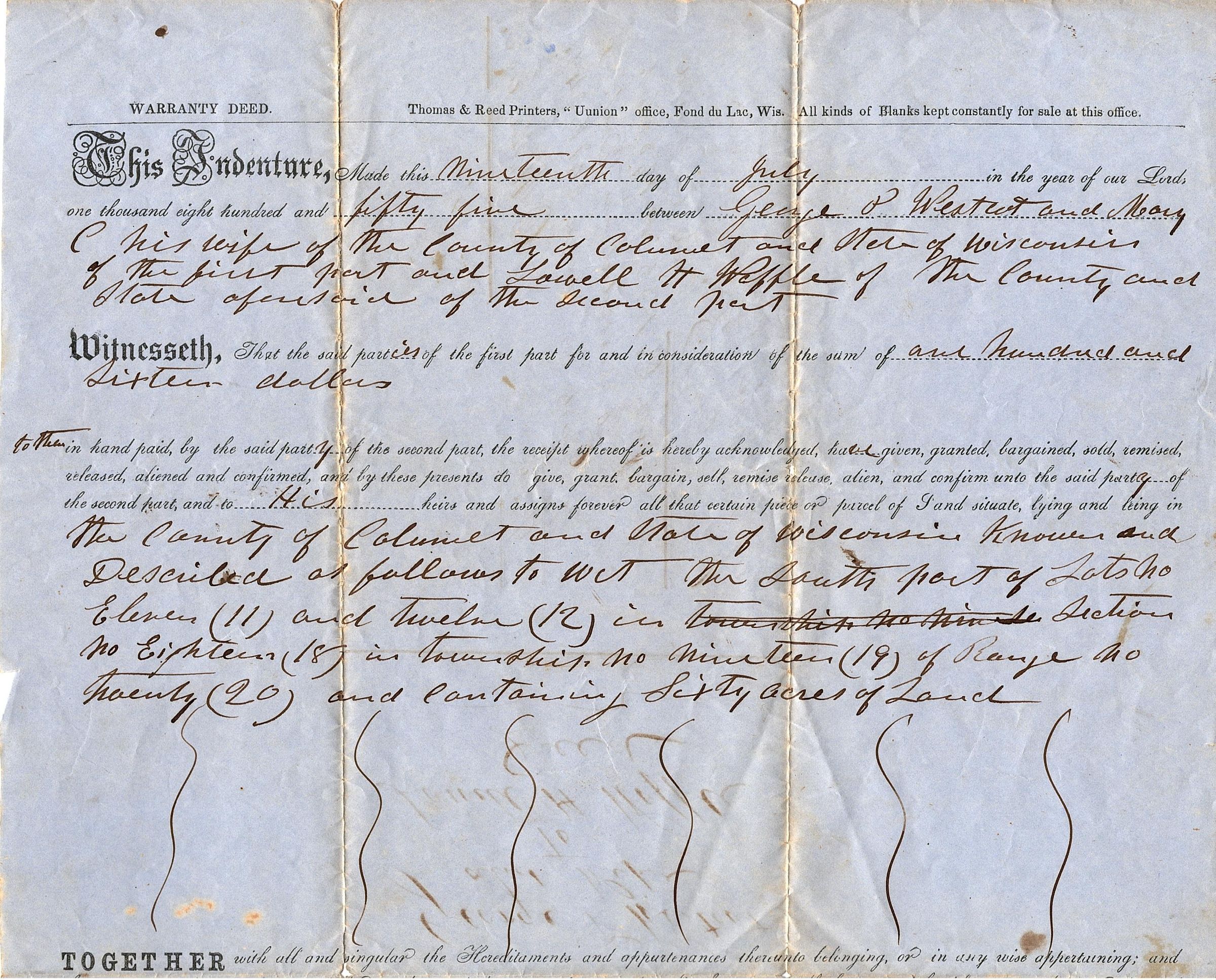 Oversized official document-warranty deed. George P. Westcot and wife to Lowell H. Waffle. Register's Office, Calumet County. Received for record July 23rd A.D. 1855. Printed form is a blue paper printed by "Thomas & Reed Printers, 'Union' office, Fond du Lac, Wis." The form was filled out in a black ink. There are six squiggly lines that extend straight down from the written paragraph at the top to the printed paragraph in the middle.Collection
