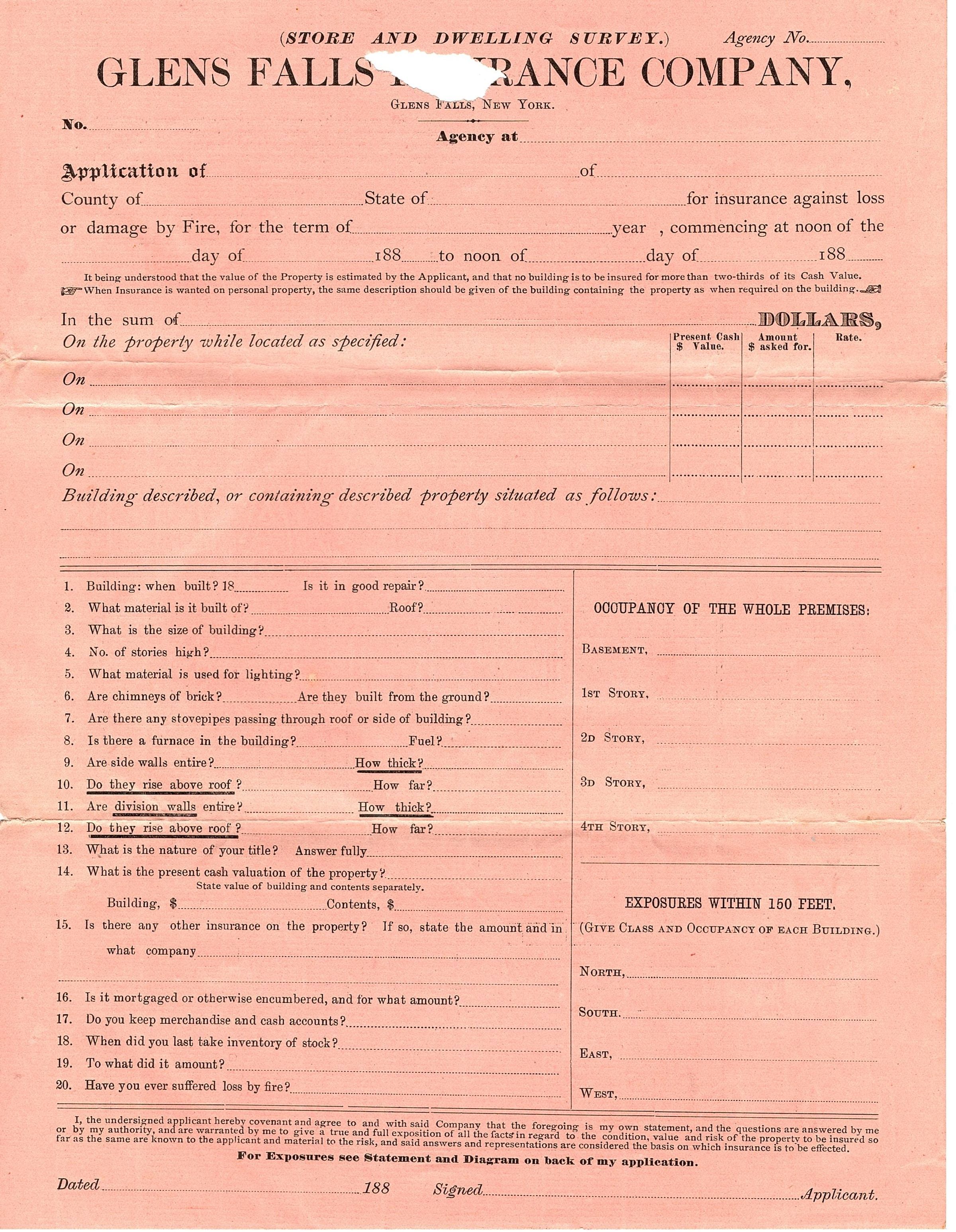 Single page application for Glens Falls Insurance, not filled out. It is on pink paper and is double sided.Collection