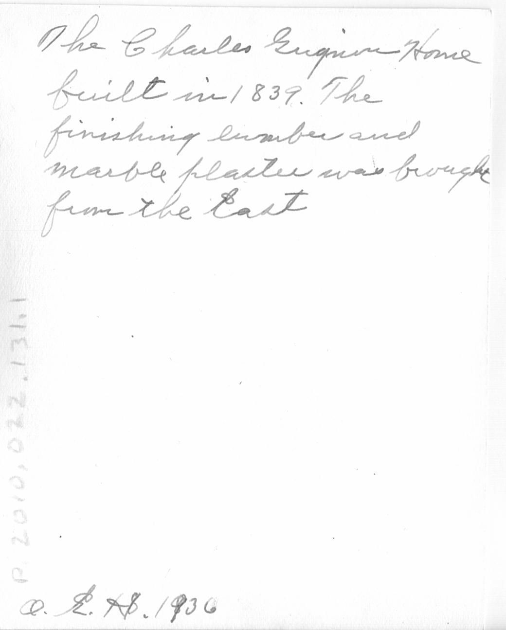"The Charles Grignon home built in 1839. The finishing lumber and marble plaster was brought from the East. O.E.H. 1936"Type