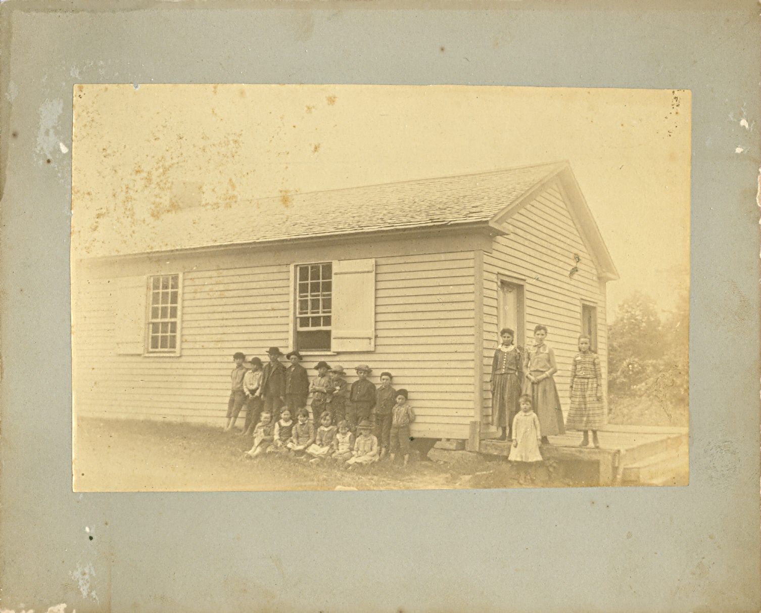 Black and white photograph glued to a gray matte backing. The photograph depicts a light colored sided house with two doors in the front. There are two groups of children standing in front of the house. One group has 15 students standing against the side of the house, six of them are sitting in front of the other 8 standing. All those standing are boys and the ones sitting seem to be all girls. There are also four girls standing on the porch on the front side of the house.