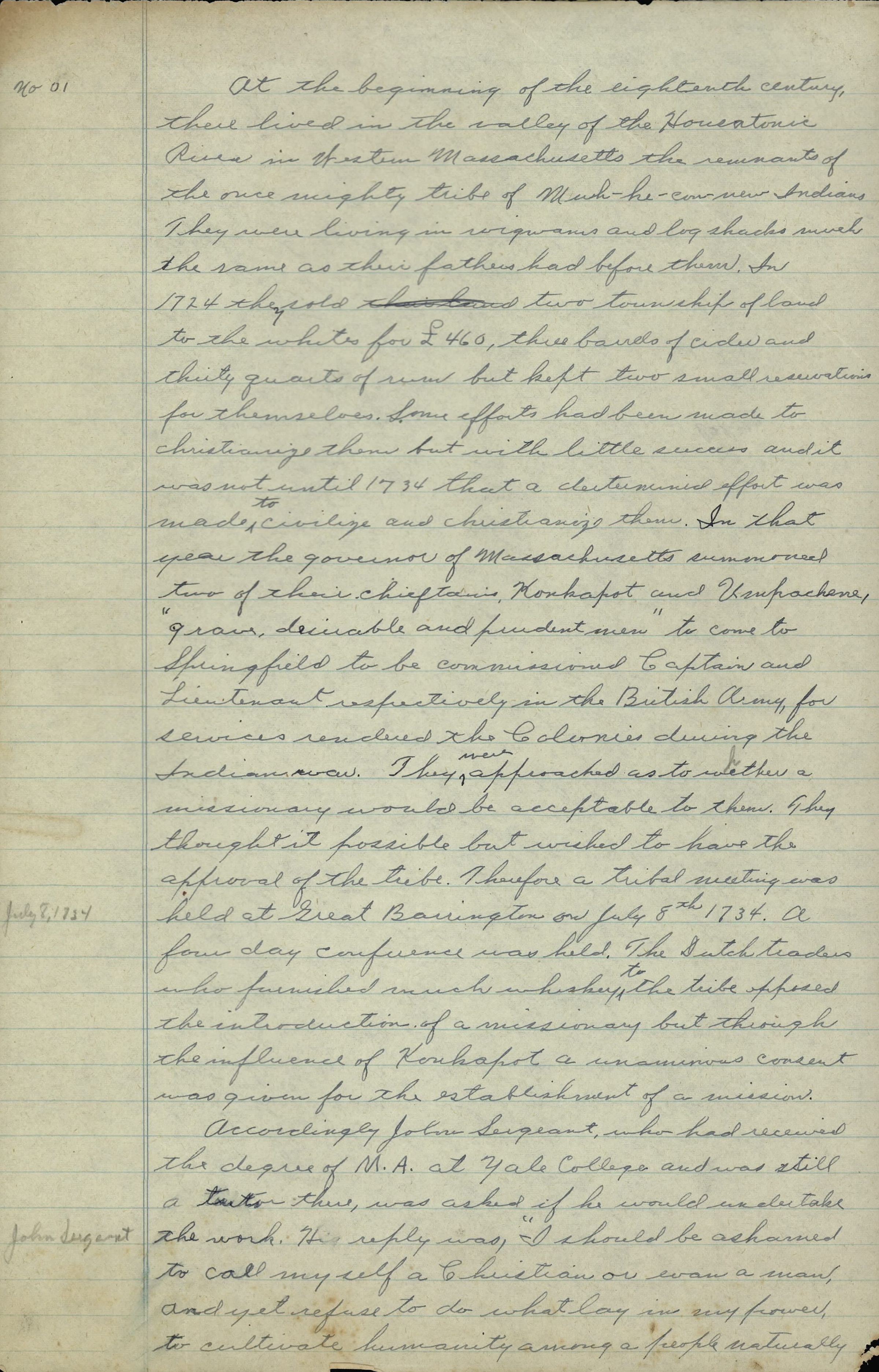 The first line reads "At the beginning of the eightenth [sic] century, there lived in the valley of the Housatonic River in Western Massachusetts the remnants of the once mighty tribe of Muh-he-cau-new Indians."Collection