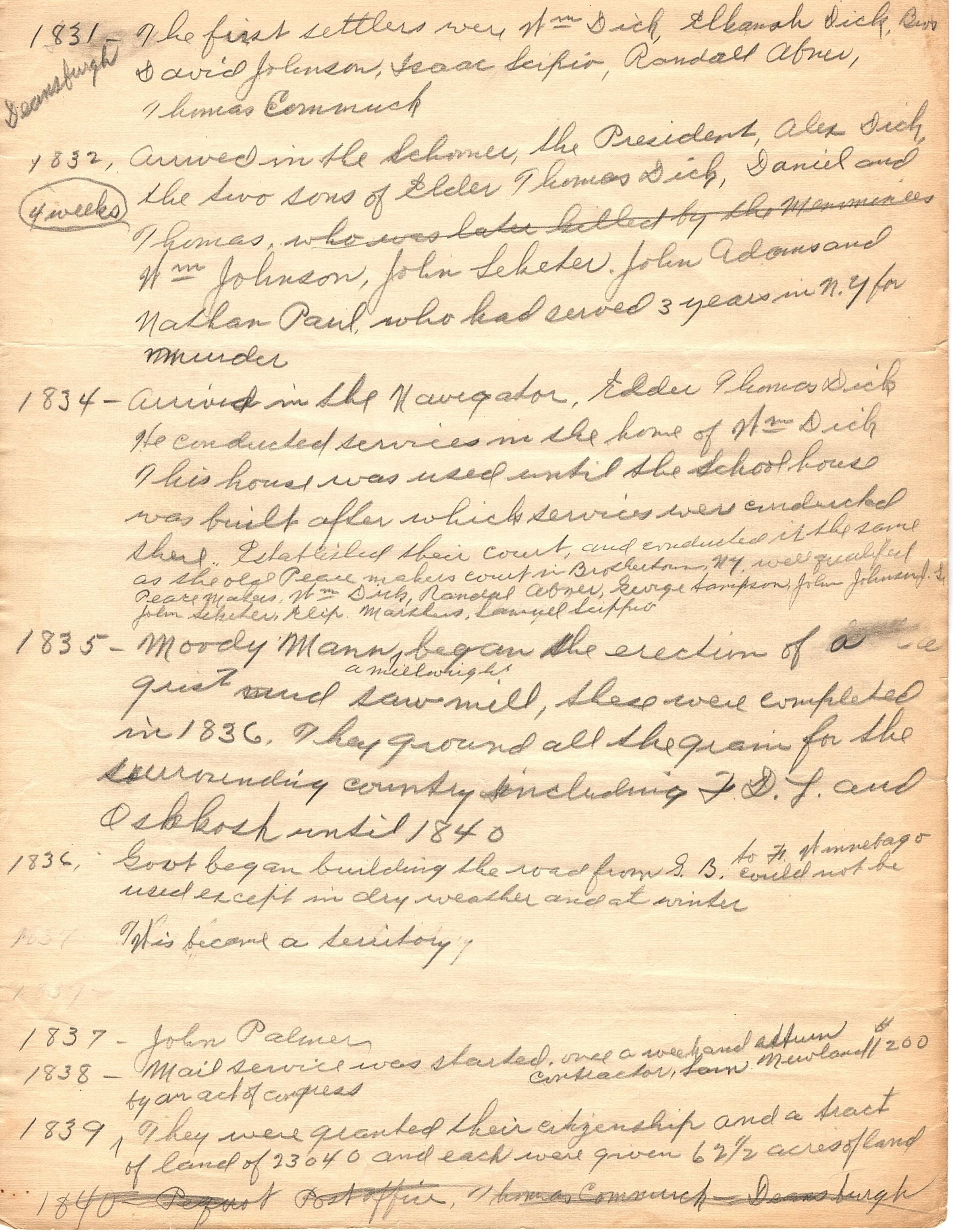 Four pages of handwritten notes in pencil. Writing on only one side of each sheet. Last page is written in black ink and last two pages are out of order chronologically from first two. Keeping them all together because that's the way they came. First page starts with 1831 "The first settlers were Mrs. Dick, --Dick, -- David Johnson, Isaac Sci--, Randall Abner, Thomas Commuck" and is listed at Deansburgh. The second page starts with 1840 "Held their first county election at the home of --- Dick, and the mission house at Stockbridge". Third page is out of order and goes back to 1843 and the steamboat brought from Buffalo to Green Bay. Last page in black ink starts with 1831and repeats what was said on the first page under 1831. Most of the information is the same on the last page as the first just written differently and 1832 is added as a date.Collection