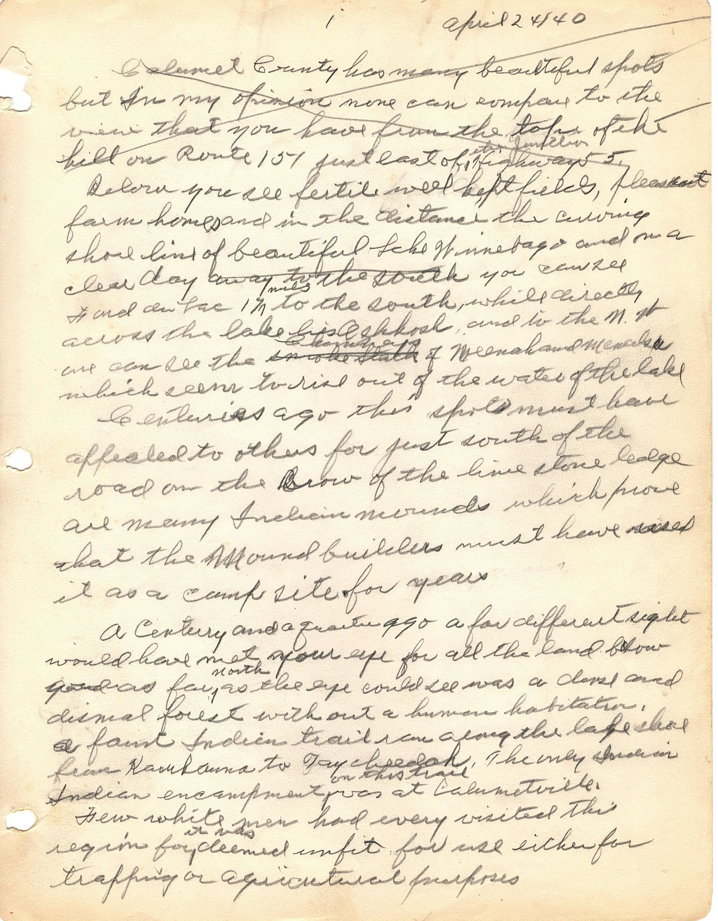 21 sheets of paper with hand written notes in pencil. Most only have writing on the front but a few have shorts notes on the back (included in scan). The pages are numbered along the top edge in the middle. The first lines of the first page are X'd out but start "Calumet County has many beautiful spots but in my opinion none can compare to the view that you have from the top of the hill on Route 151..." The date April 24/40 is at the top of the first page. Each page has three holes punched in them to place in a binder. It seems to be a history of the tribe from the very beginning. It ends with "Thus we leave them sincerely hoping that they have found the justice and peace for which they so long sought in that land far beyond the setting sun". It is signed at the bottom of the last page "5/9/40 OH."Collection