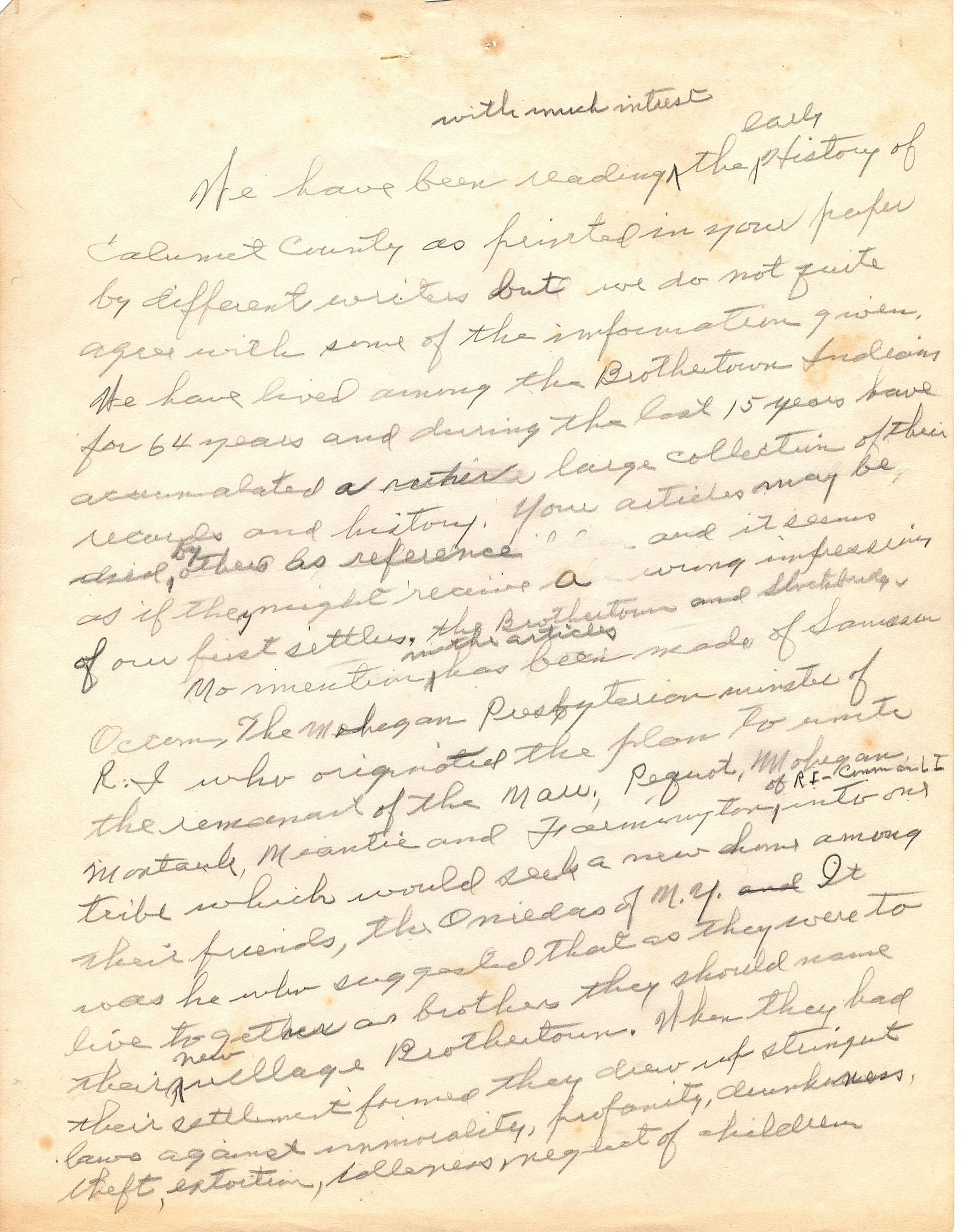 6 sheets of handwritten notes on only one side of each sheet of paper. The notes are written in pencil. Pages 2-6 are numbered at the top in the middle. The first page begins "We have been reading with much interest the early History of Calumet County as printed in your paper by different writers but we do not quite agree with some of the information given..." It goes on to explain how they (the writer) has lived among the Brothertown for 65 years and proceeds to lay out a brief history of the tribe starting with Occum, whom the paper has not mentioned.Collection