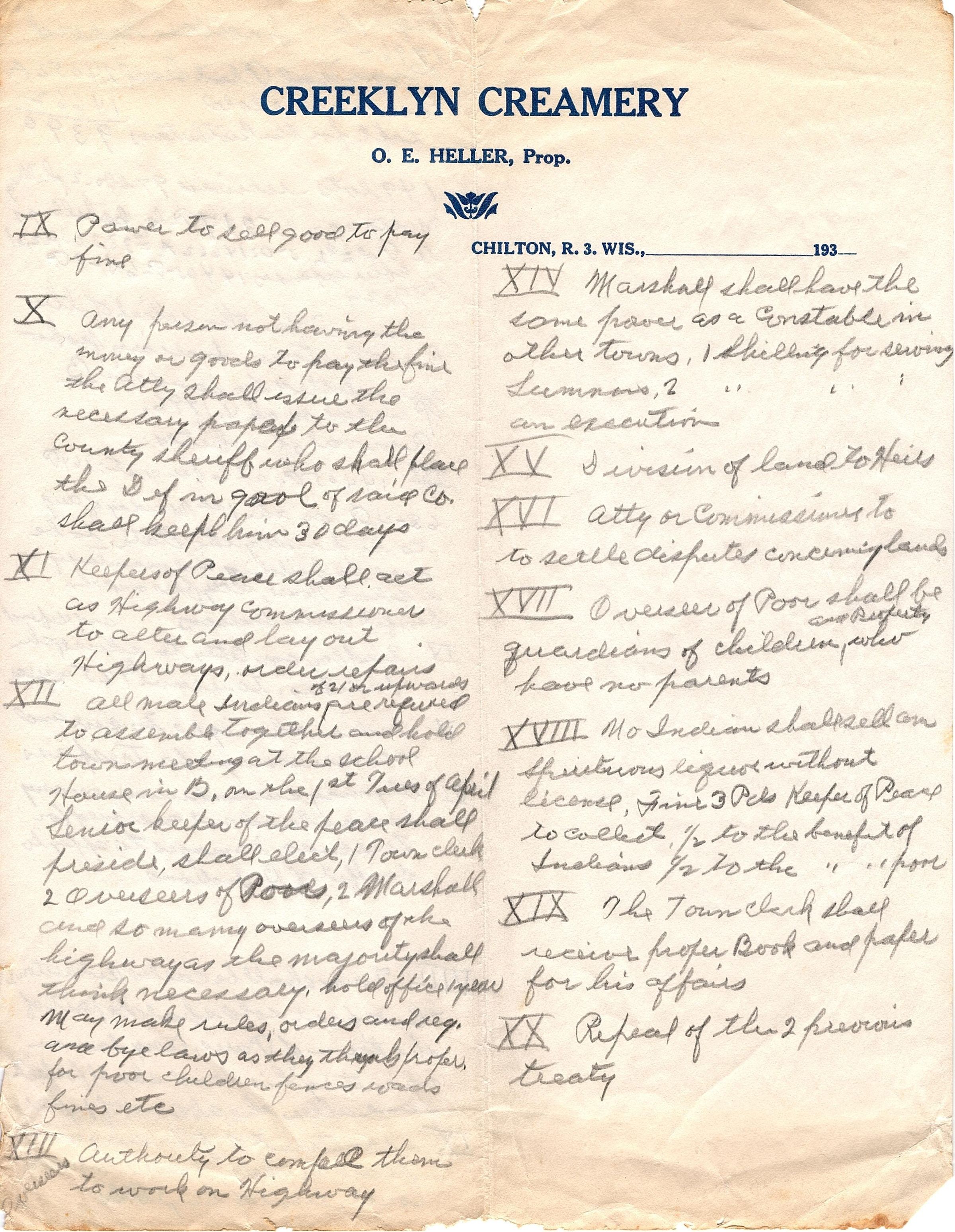 Single sheet of handwritten notes in two columns on Creeklyn Creamery letterhead paper. The notes come from an unknown book and start with roman numerals on the front page. The first one reads "IX. Power to sell good to pay fine". The back of the paper has written notes only in the second or right column that starts "Page 16 Indian Record" and ends at the bottom with "IX appointment of 5 Indians as peace makers. Power to hold a court, limit of fine, 5 pds".Collection