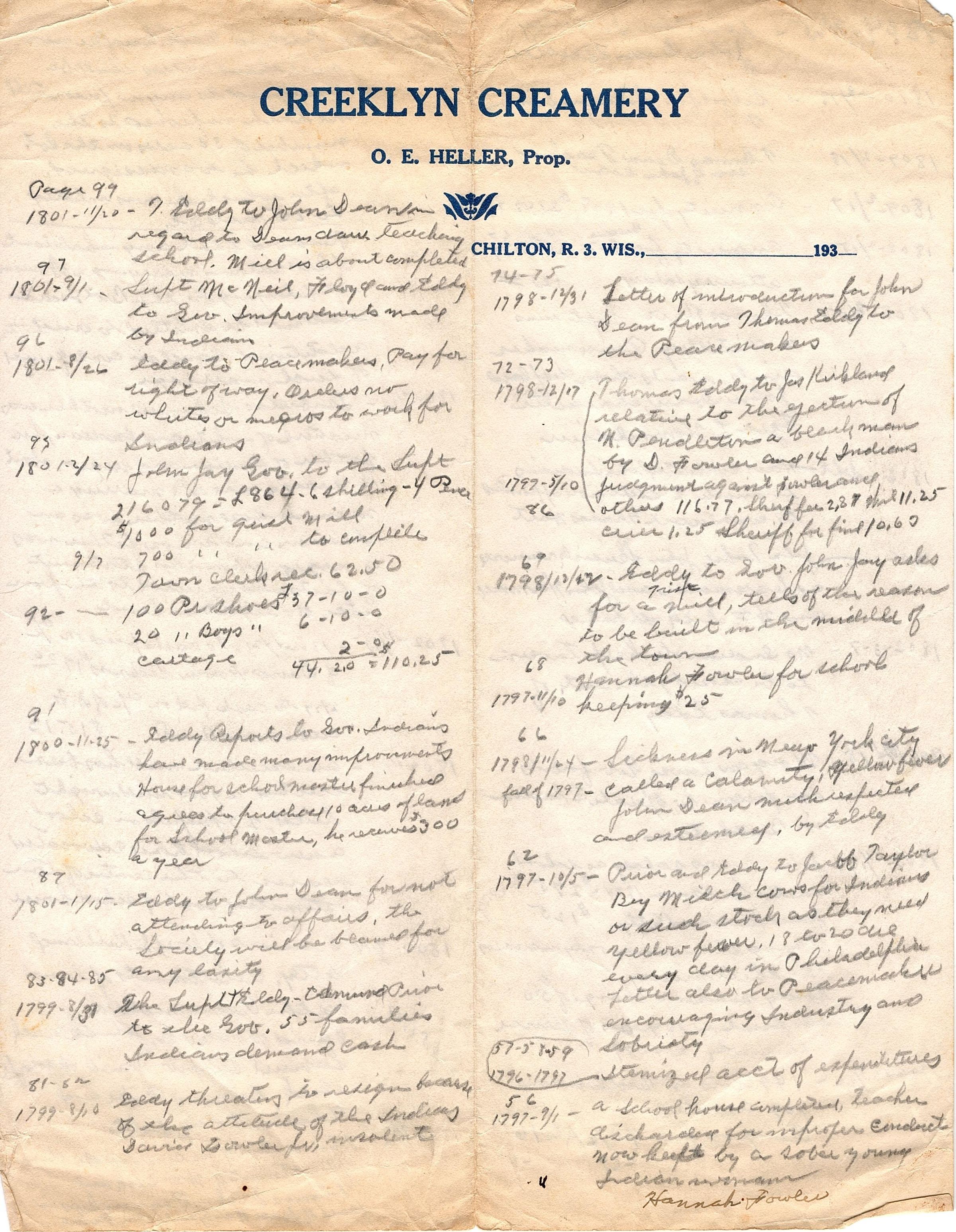 Single sheet of handwritten notes from an unknown book. The notes are written on Creeklyn Creamery letterhead by Otto Heller. The first note reads "Page 99, 1801- 11/20 T Eddy to John D--, regard to Deans..." The notes are in two columns and continue onto the back of the sheet of paper also in two columns. The last note on the back page, second column reads "1802-7/16 Thomas Eddy recommends the appointment of Mrs. Dick and Thomas Dick as Peacemakers in place of Isaac Wauby and John Tuhie.Collection