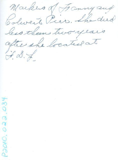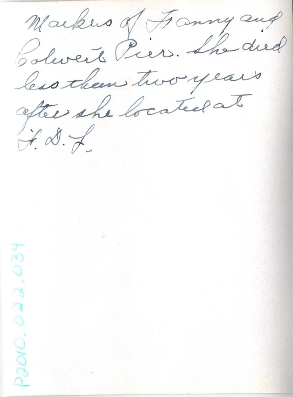 Written in black ink on the back is "Markers of Fanny and Colwert Pier. She died less than two years after she located at