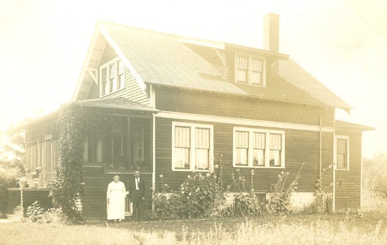 Black and white postcard of a two story house with dark siding and light trim. There is an enclosed front porch with ivy growing up one corner. In front of the porch stand a woman in a light dress and a man in a dark suit with a tie.
