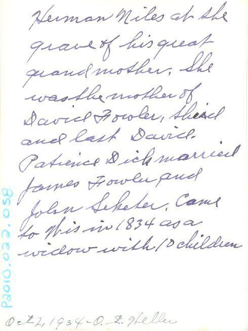 "Herman Niles at the grave of his great grandmother. She was the mother of David Fowler,-- and last David. Patience Dick married James Fowler and John Seketer came to Wis. in 1834 as a widow with 10 children" and in a different ink on the bottom "OCt 2, 1934- O.E. Heller"Location