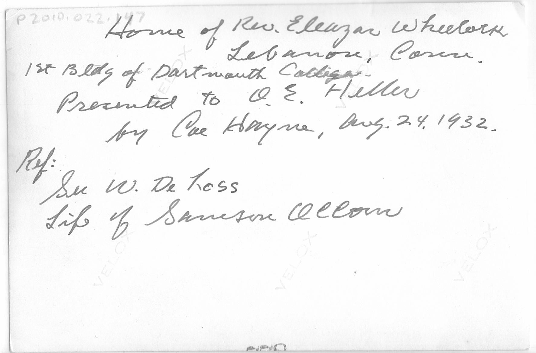 Written in black ink on the back "Home of Rev. Eleazer Wheelock, Lebanon, Conn. 1st Bldg of Dartmouth College. Presented to O.E. Heller by Cae Hayme, Aug 24, 1932. Ref: See W. De Loss Life of Samson Occom."Collection