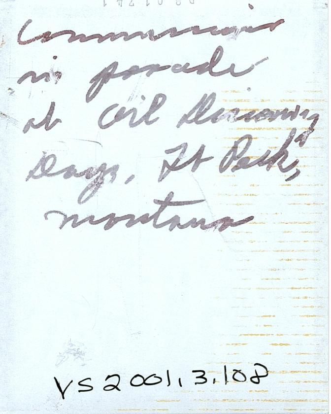 Black and white photograph of a male and female each on a horse. They are both wearing Native regalia including a headdress and a headband with a single feather standing up in the back. Behind them are multiple parked cars. Written in thick black ink on the back "Commissioner in parade at Oil Discovery Days, Ft Peck, Montana."Photograph Details
