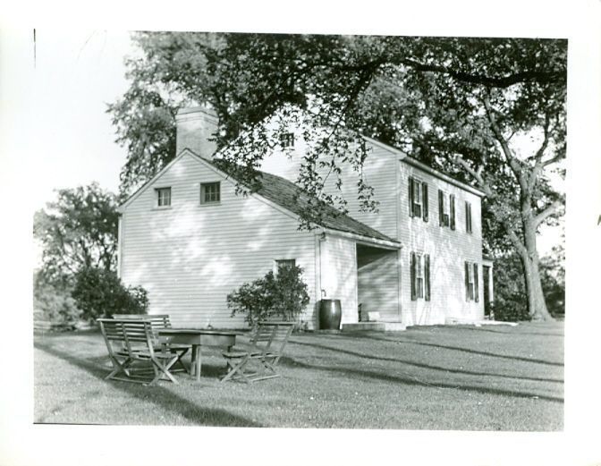 Black and white photo looking at a two story house from the back/side. There is a table and wood folding chairs on the lawn.