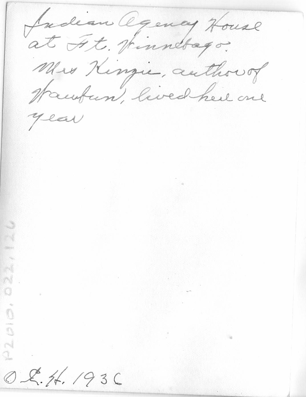 Written in black ink on the back "Indian Agency House at Ft. Winnebago. Mrs. Kinzie, author of Waufun?, lived here one year. O.E. H. 1936."Collection