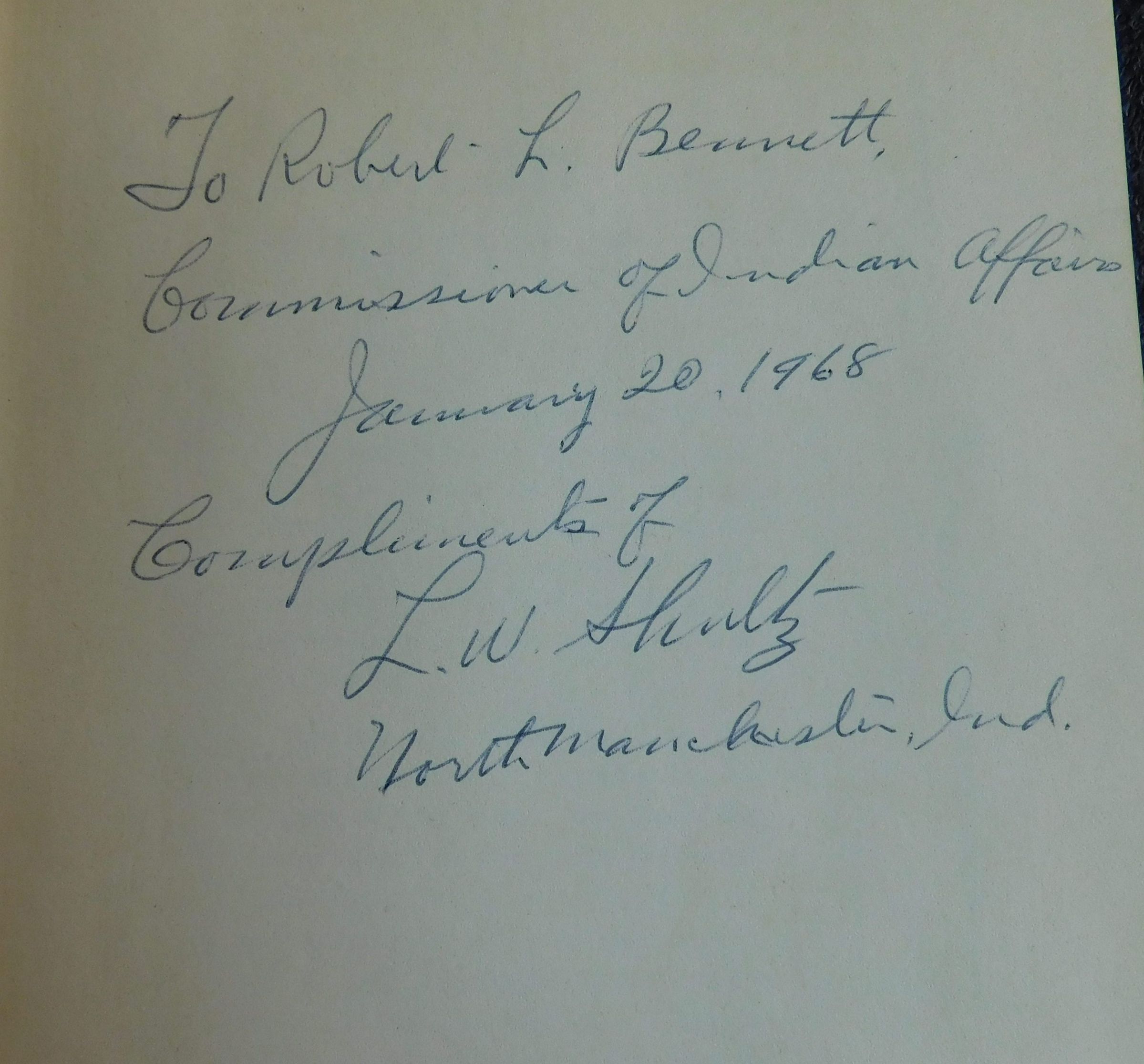 To Robert L. Bennett, Commissioner of Indian Affairs, January 20, 1968. Compliments of L.W. Shultz, North Manchester, Ind.Type