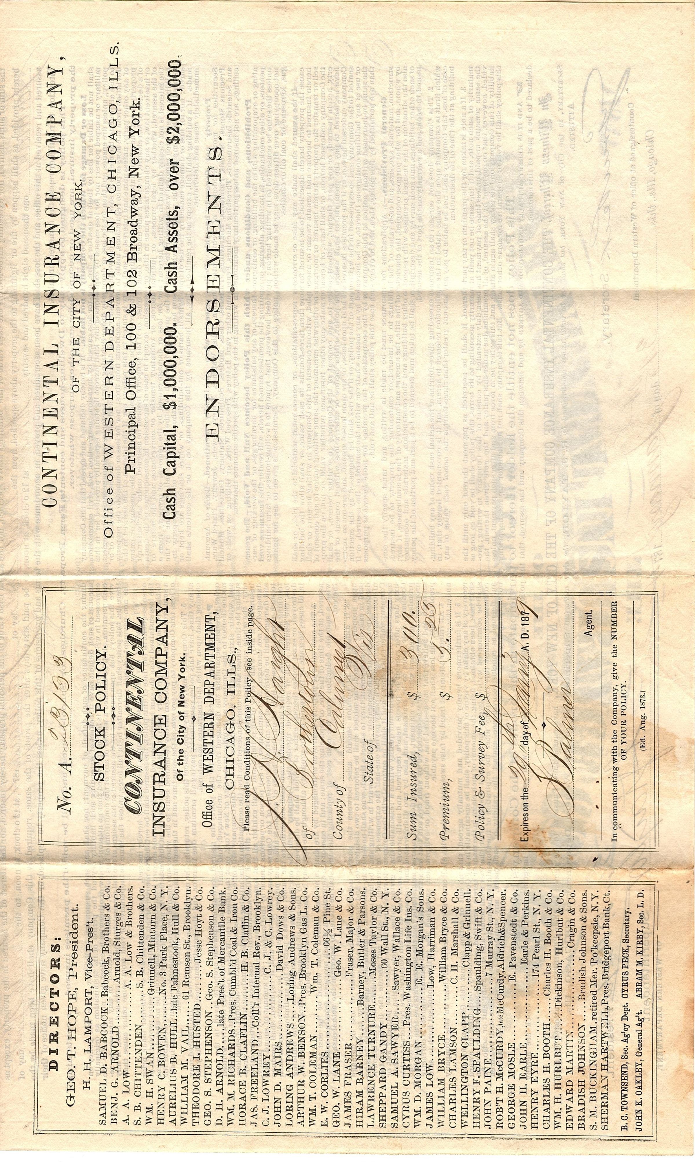 Official document-insurance policy. Insurance policy for J. H. Haight of Brothertown County of Calumet, State of Wisconsin. Sum insured is $300 on the back and it expires on Jan. 29, 1879. The back of the insurance policy also lists Alex Fowler as the purchaser of the property. The policy is folded in half and has a larger section on the inside that breaks down the policy.Collection