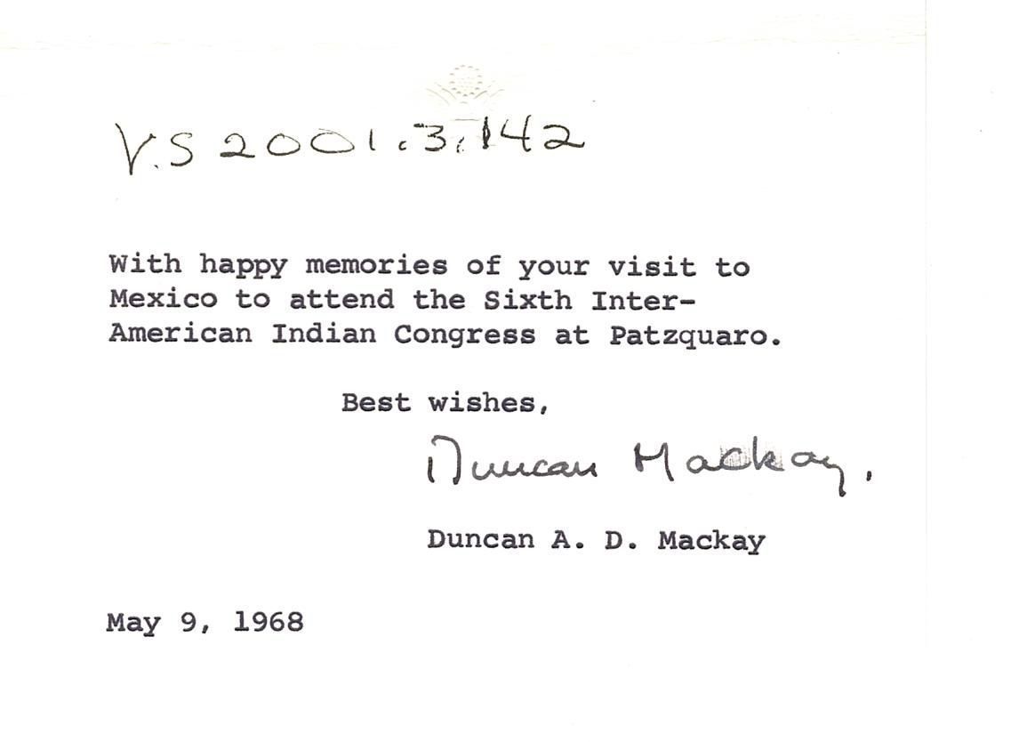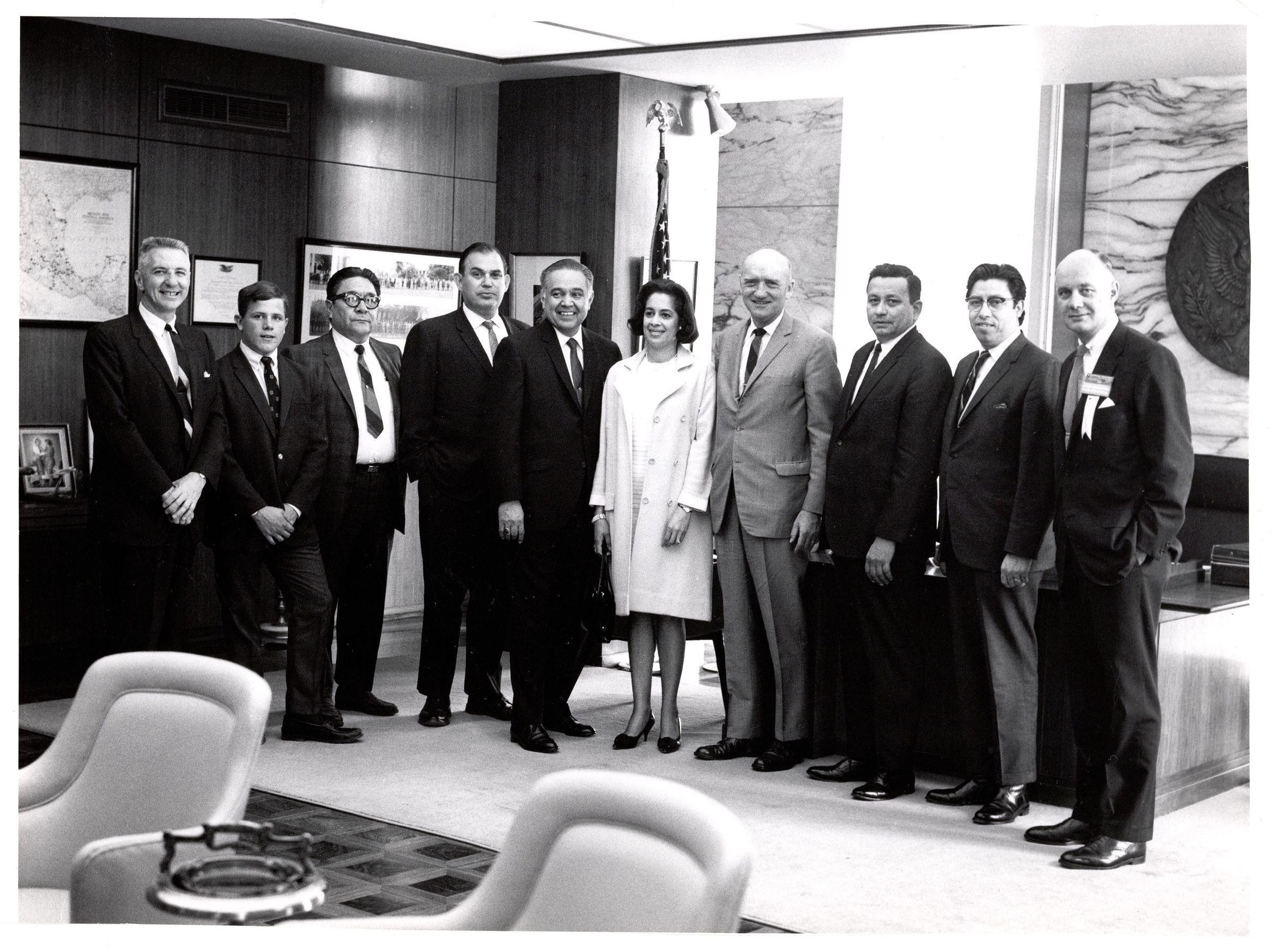 Black and white photo of a group of nine (9) men and one (1) woman standing in a line in a large office. Typed on the back "With happy memories of your visit to Mexico to attend the Sixth Inter-American Indian Congress at Patzquaro. Best wishes, Duncan A.D. Mackay, May 9, 1968."Photograph Details