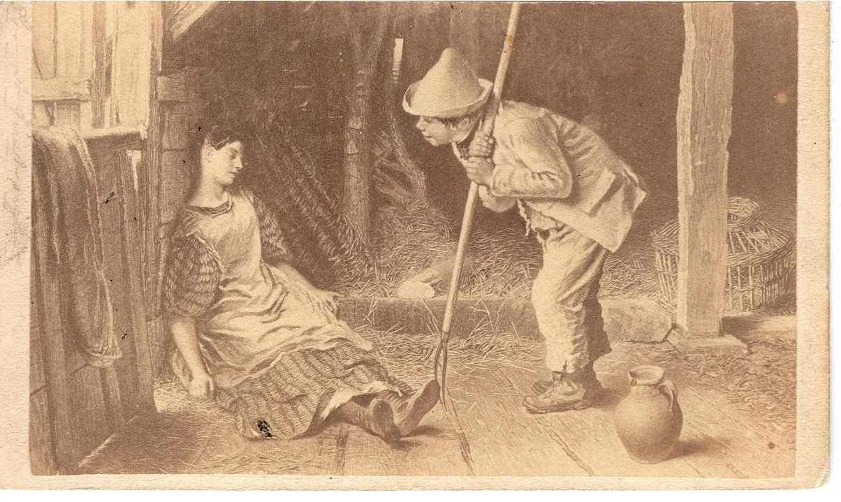 BC2010.022.343C is a card with a picture of a boy standing over a sleeping woman on a porch. There is writing on the back in both pencil and blue ink. The pencil is too faded to read, but the blue ink reads "Compliments of J.V. Dick, -- 36 Wis-- 1st Brigade 2nd Div --, Richmond Va". It is with this wedding invite because it was together with the wedding invite from previous archivist. Unsure if it came together as a set.Collection