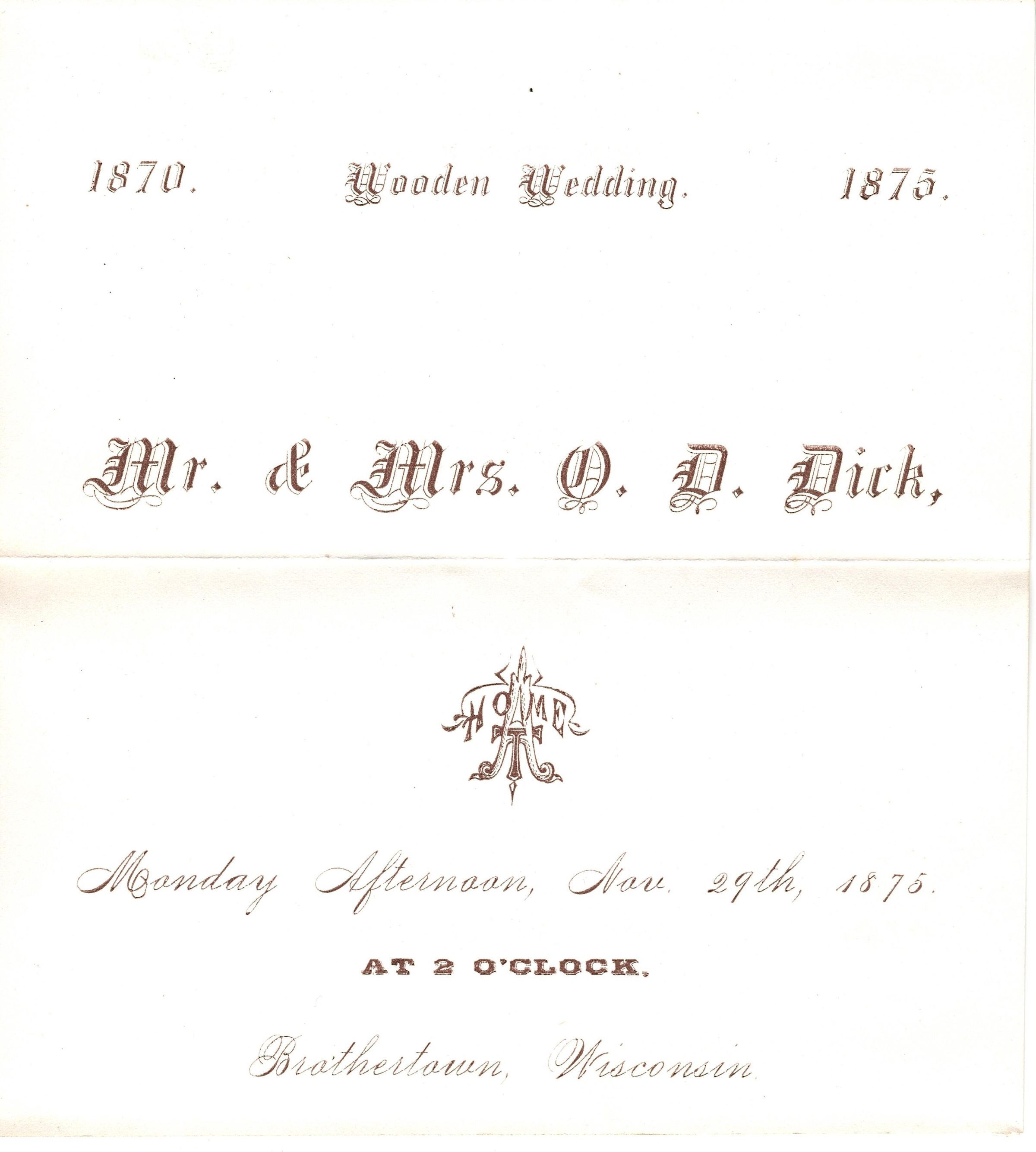 Wedding invite that reads "1870. Wooden Wedding. 1875. Mr. & Mrs. O.D. Dick, Monday Afternoon, Nov 29th, 1875 at 2 o'clock, Brothertown, Wisconsin". The invite is a folded piece of cardstock paper but only has content on the front.