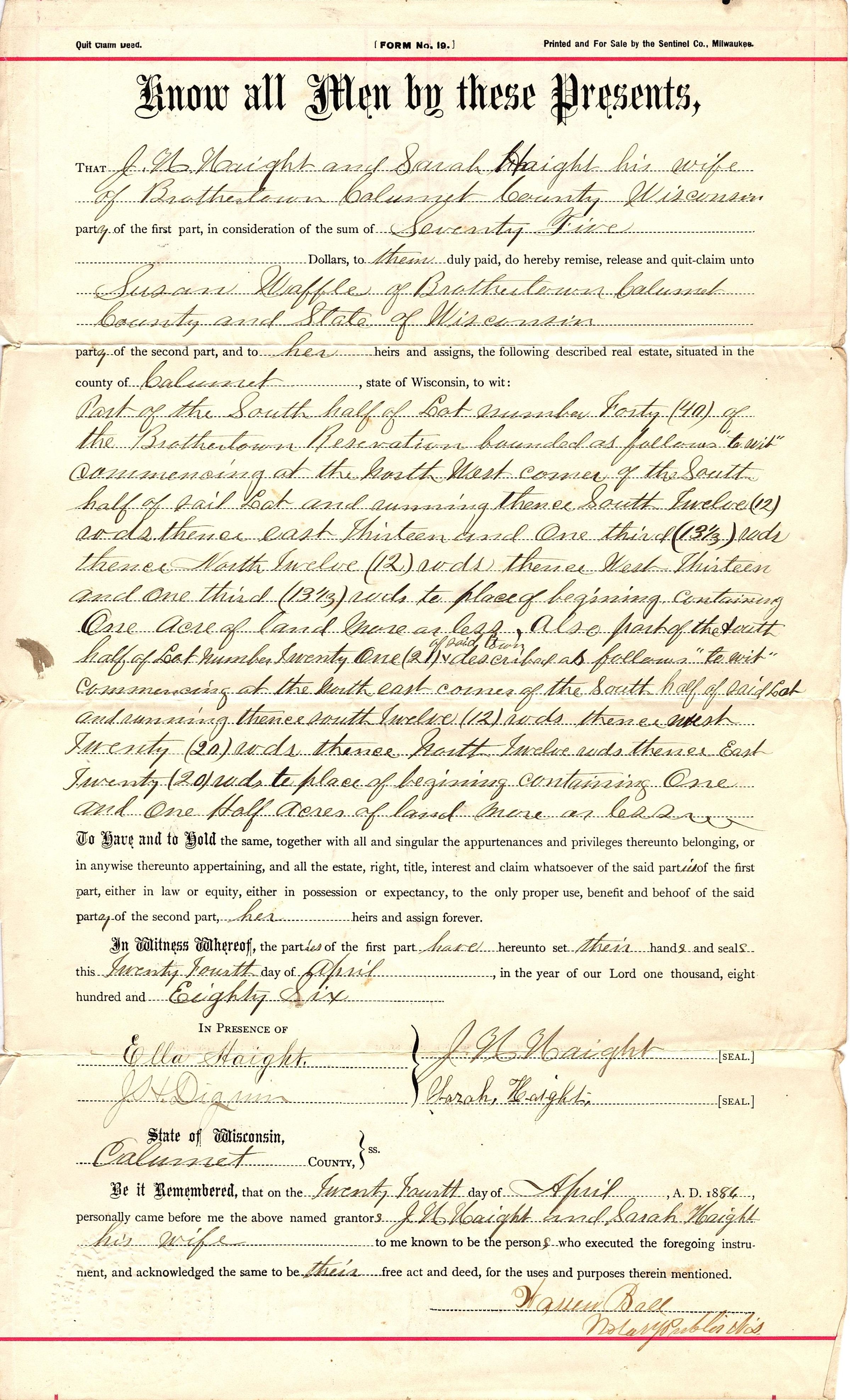 Official document-quit claim deed. J.H. Haight and wife to Susan Waffle. Register's Office, Calumet County, Recorded Oct. 19th 1886. Printed form by Sentinel Co., Milwaukee, filled out in black ink. At the top and bottom are red lined borders. In the middle of the top it reads "Know all Men by these Presents".Collection