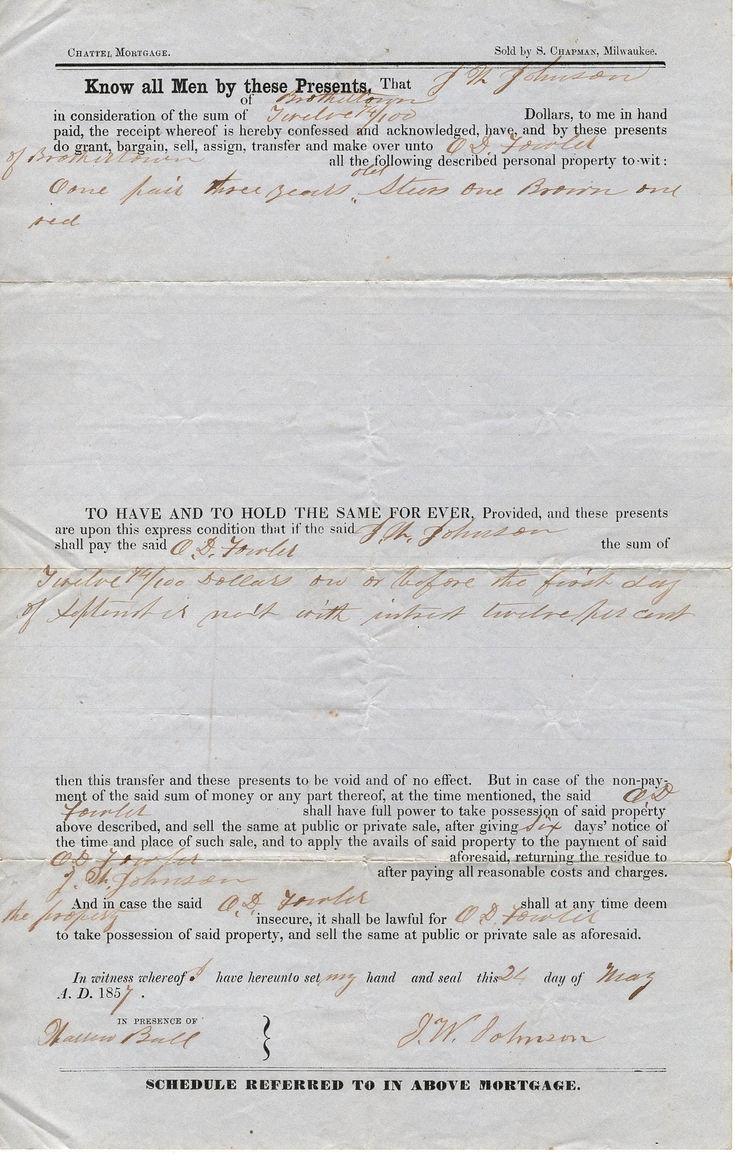 Official document-mortgage. J.W. Johnson to O.D. Fowler, Chattel Mortgage, May 24th 1857. The mortgage is a form printed on a blue sheet of legal sized paper and sold by S. Chapman, Milwaukee. It is a mortgage for personal property of one pair three years old steers, one broom and sed.Collection