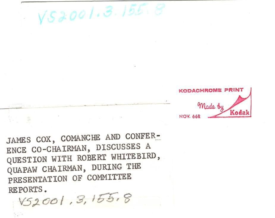Colored photo of two men standing behind a podium with a large tapestry in the background of medieval men and women around a fountain. The back reads "James Cox, Comanche and conference co-chairman, discusses a question with Robert Whitebird, Quapaw Chairman, during the presentation of committee reports."Photograph Details