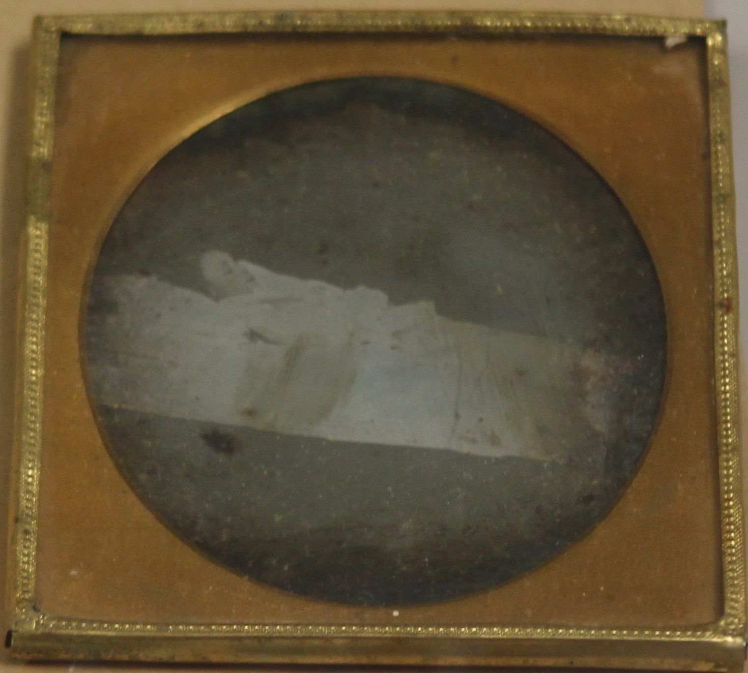 Death picture of a male child, framed in a gold frame with a fold oval matte on top of the daguerreotype to frame the child. He is lying in a bed or coffin with covers over him. The photo fades in a circle around the image. The frame is bent copper material around the daguerreotype.