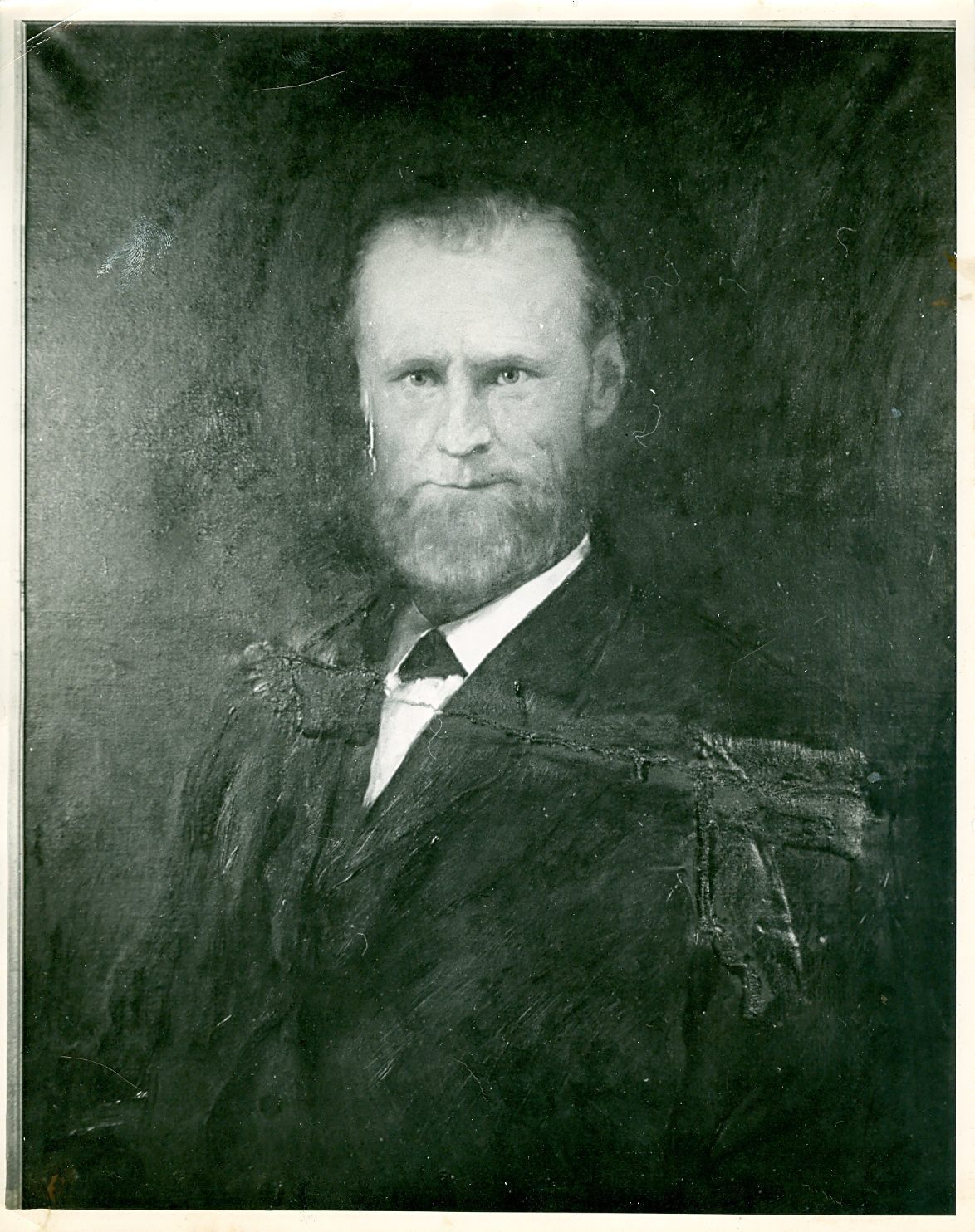 Black and white photograph of a man in a suit. He has just a beard, no moustache, his hair is slicked back, and his suit is dark.