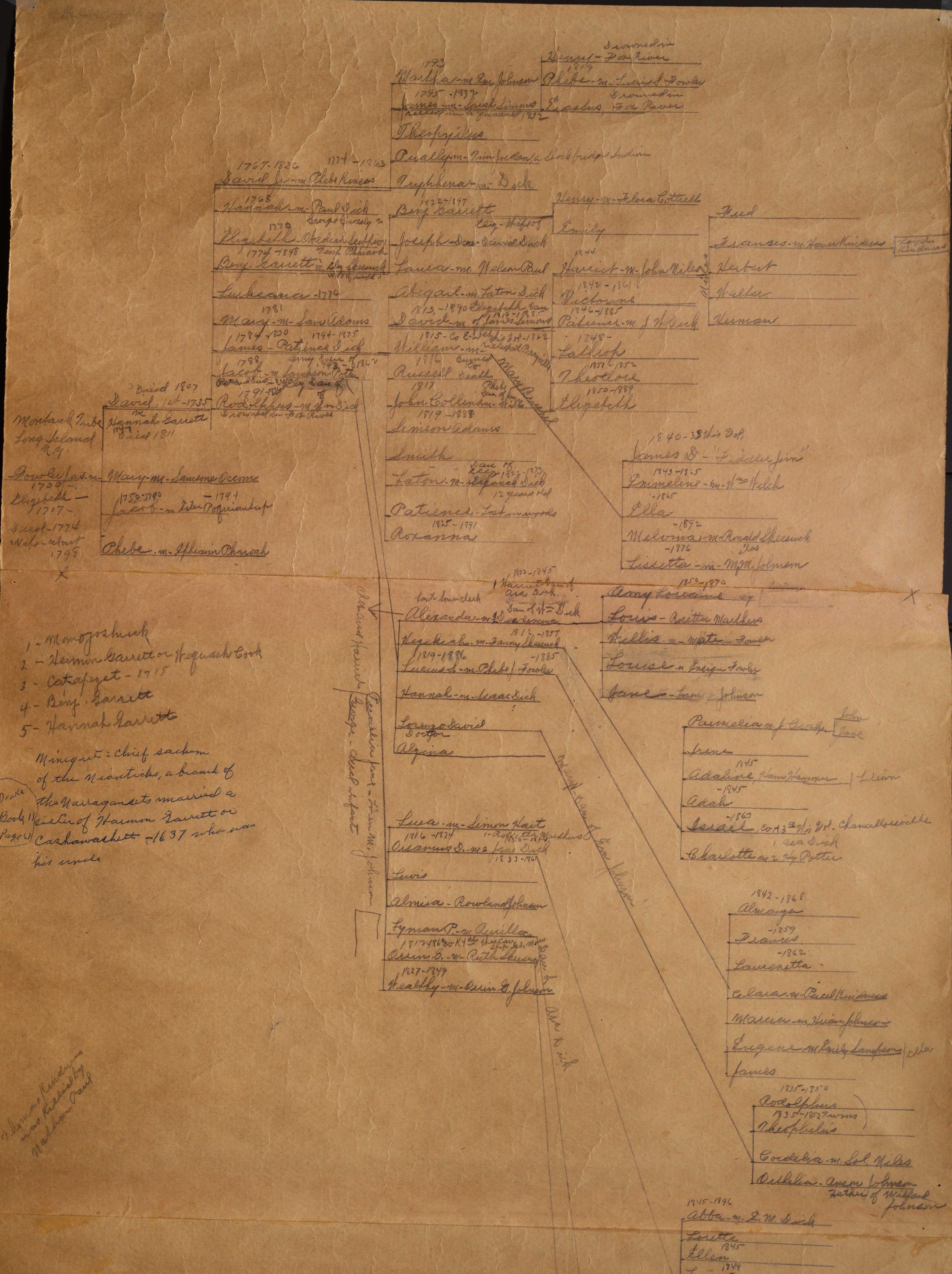 Family tree of Jas Fowler on an oversized piece of brown paper made up of three separate pieces of paper glued together. The tree shows four, possibly five, generations.Collection