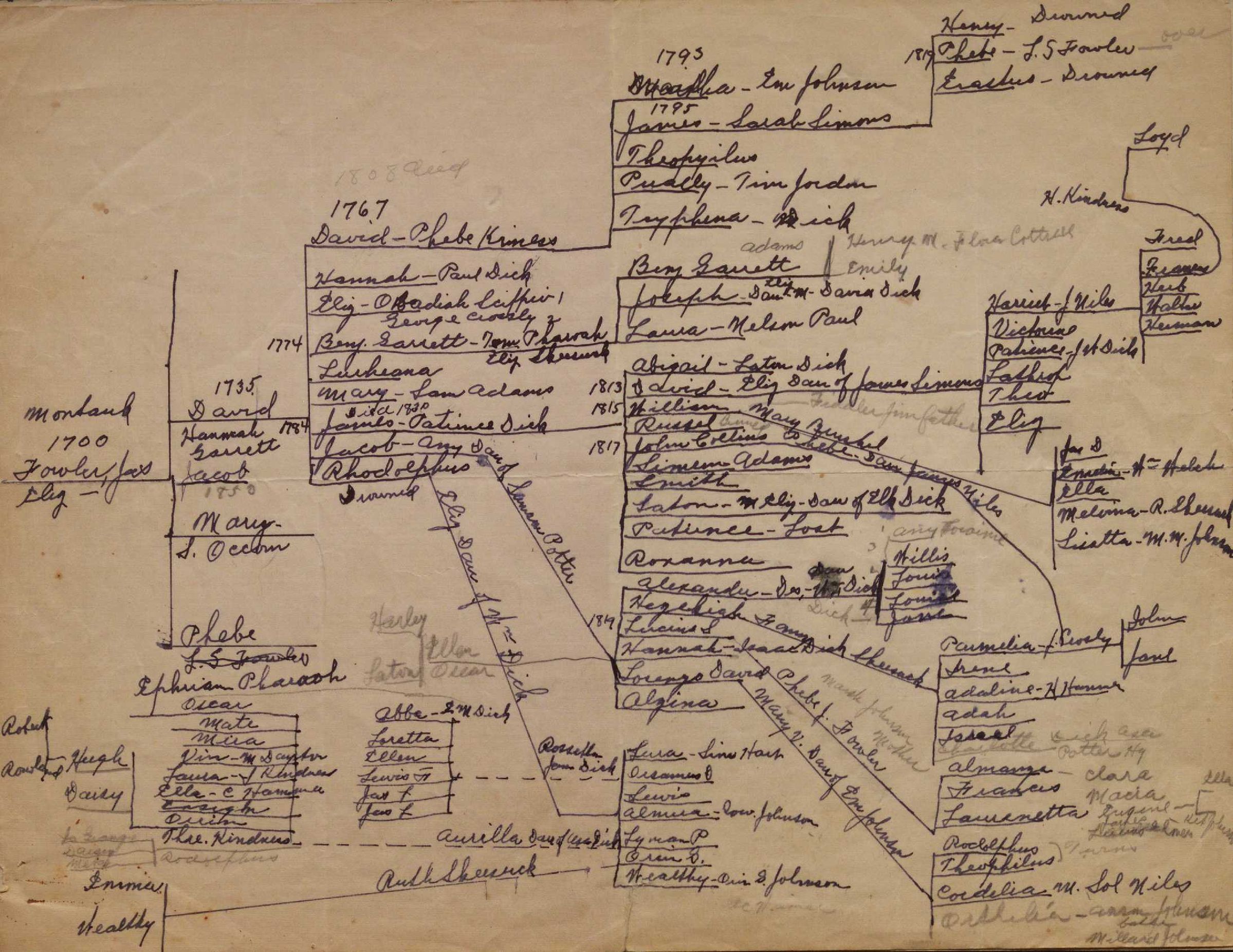 Family tree of Jas Fowler (Montauk). It goes through 5 generations at least. Most is handwritten in black ink with some notes and names and dates in pencil. On the back in pencil is "Marcia-Hiram Johnson with a bracket and Ada and Ellis (their children) in the top left corner.Collection