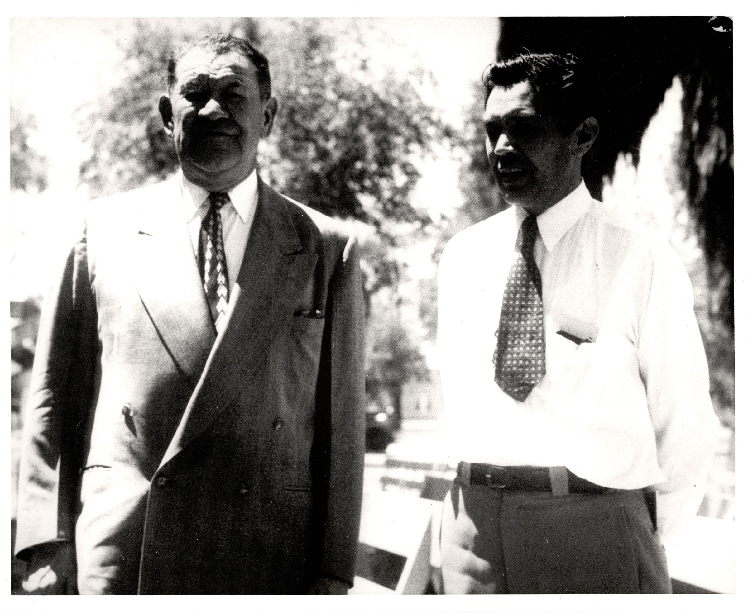 Black and white photograph of Jim Thorpe wearing a suit and tie next to an unknown man.Photograph Details