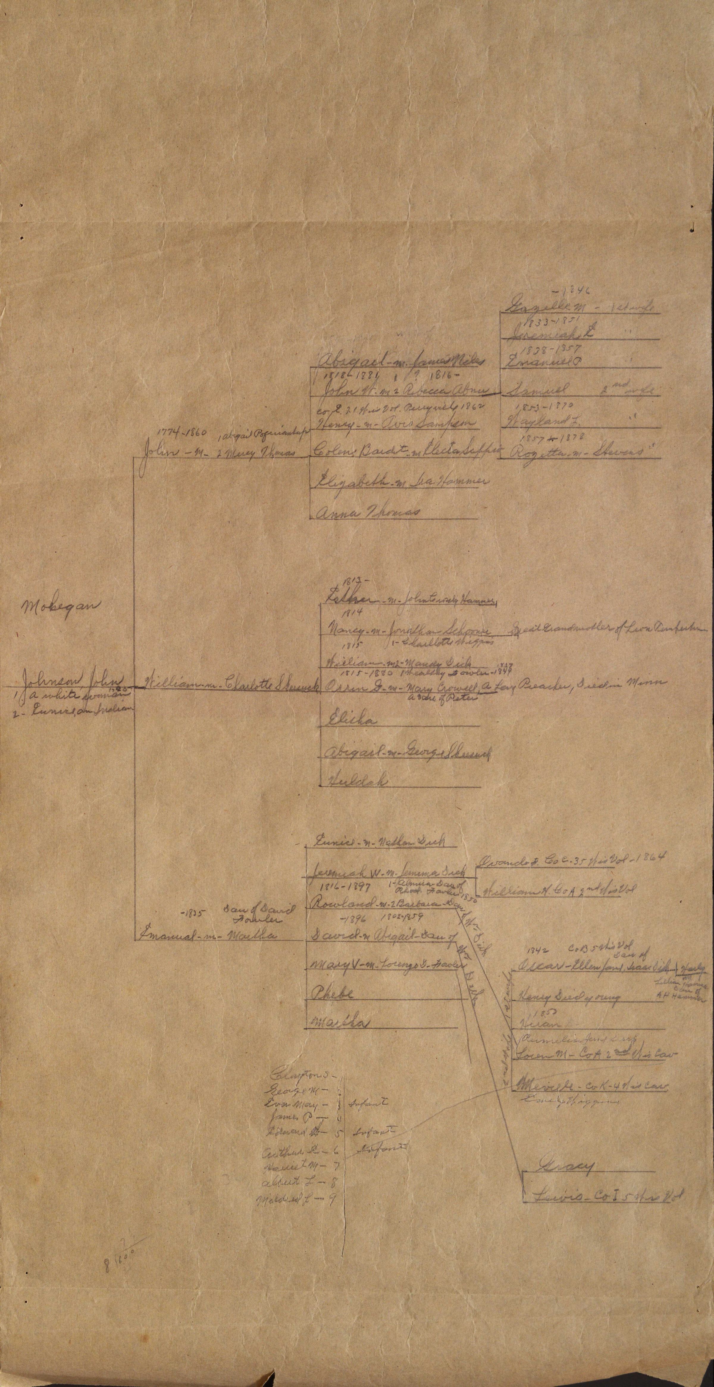Family tree of John Johnson and "A white woman" must have been his first marriage and "Eunice, an Indian" for his second marriage. The tree tracks four generations on a large piece of brown paper. It is written in black ink.Collection