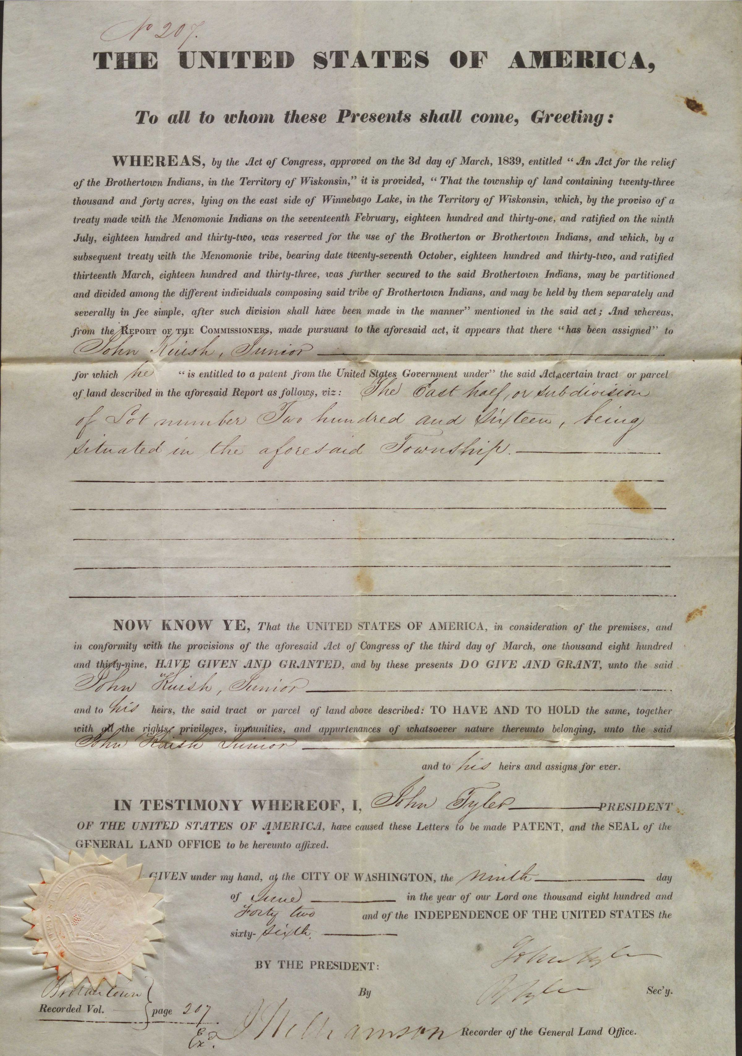Oversized official document-land patent. Official governmental form declaring John Kuish, Junior shall receive a partial lot of land taken from the Menominee Indians and given to the Brothertown Indians in accordance with "the Act of Congress, approved on the 3d day of March, 1839, entitled 'An Act for the relief of the Brothertown Indians, in the Territory of Wisconsin'." It is signed by President John Tyler on June 9, 1842. There is a cream colored stamp attached to the form in the bottom left corner with an orange or red adhesive or wax.Collection