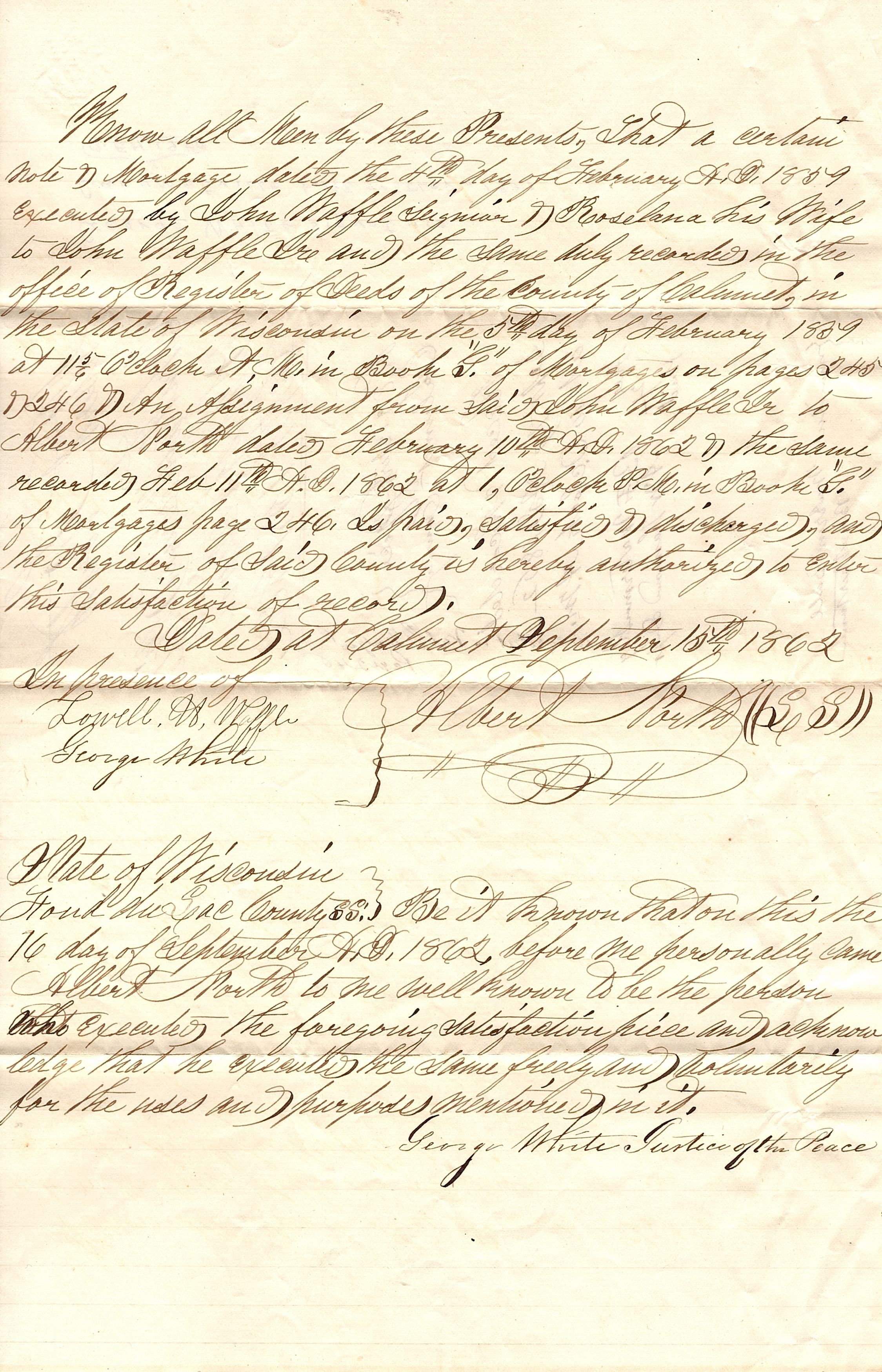 Legal sized official document-satisfaction of mortgage. The satisfaction is all handwritten on lined paper. The first name on the cover page is illegible but it appears to be a satisfaction for the mortgage between John Waffle Sr. and John Waffle Jr. Register's Office received the letter and Recorded it on Sept. 17, 1862.Collection