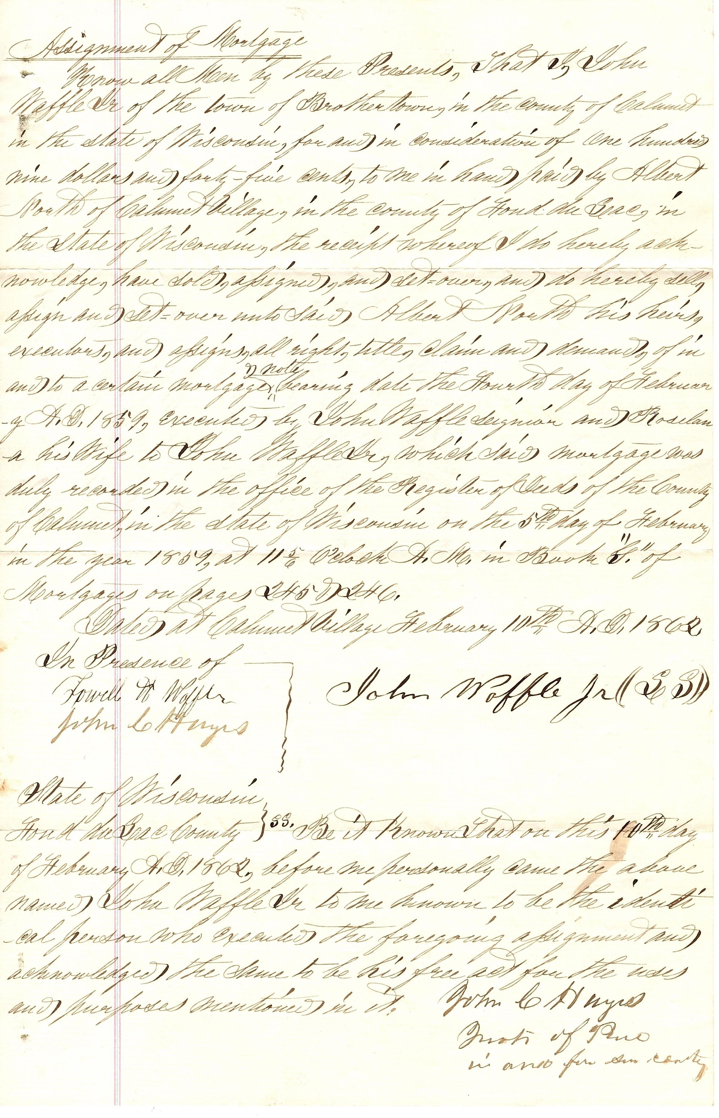 Official document-assignment of mortgage. John Waffle Sr. to Albert North. Assignment, Feb 10, 1862. Single sheet of paper with handwritten notes in black ink. At the top of the document side it reads "Assignment of Mortgage". There is a line of pink-blue-pink lines down the left side of the paper. John Waffle's signature is darker just below the middle point of the document.Collection